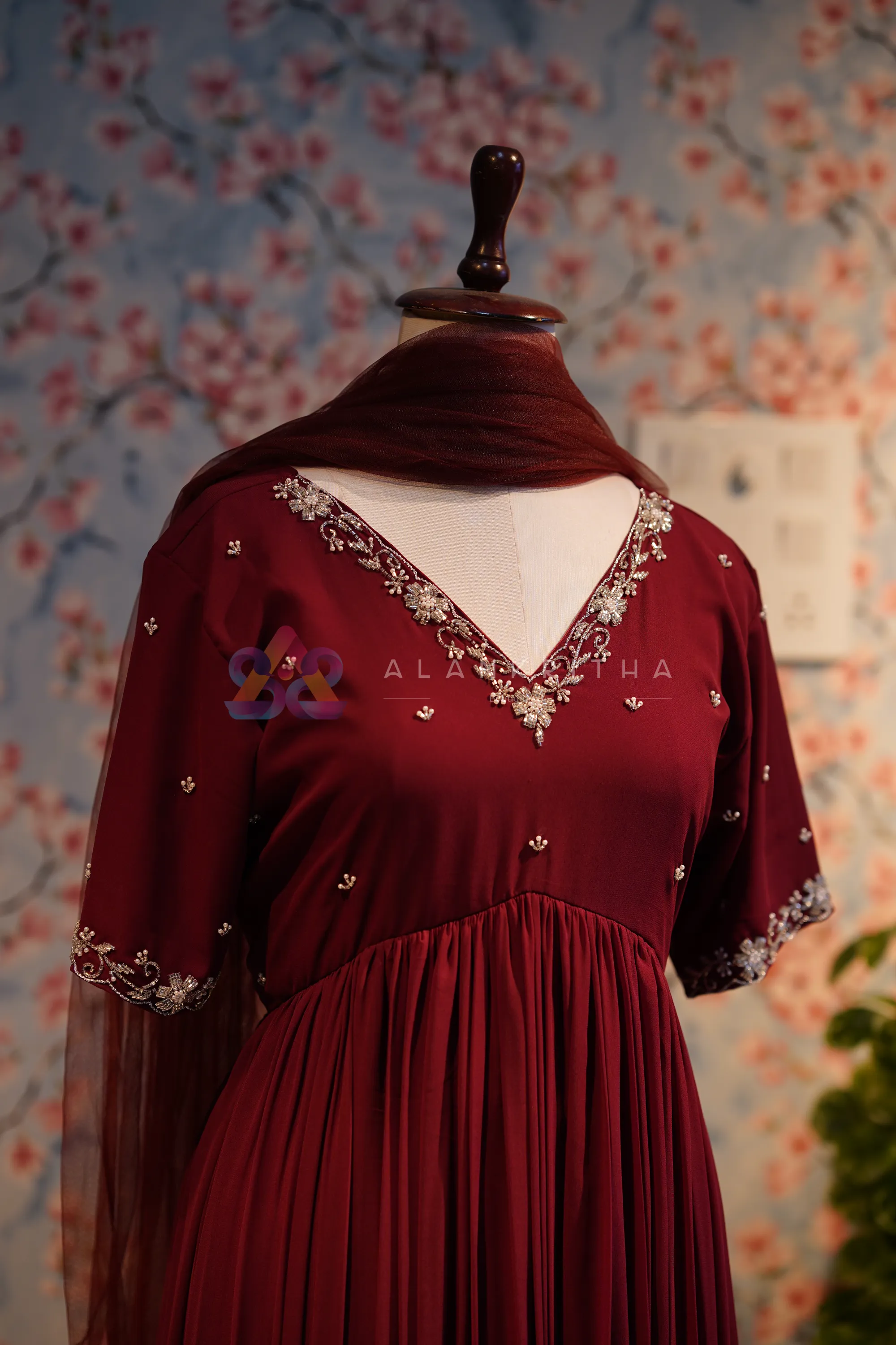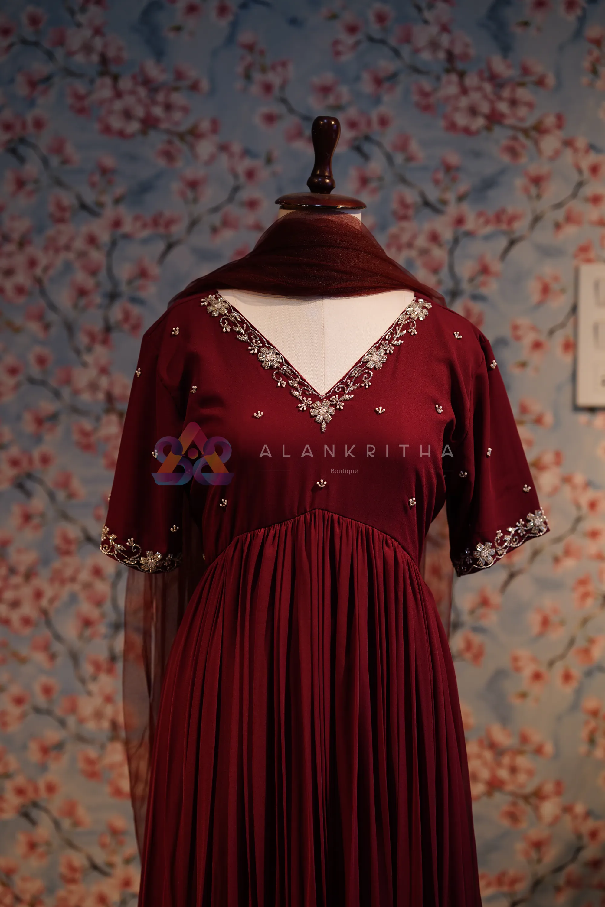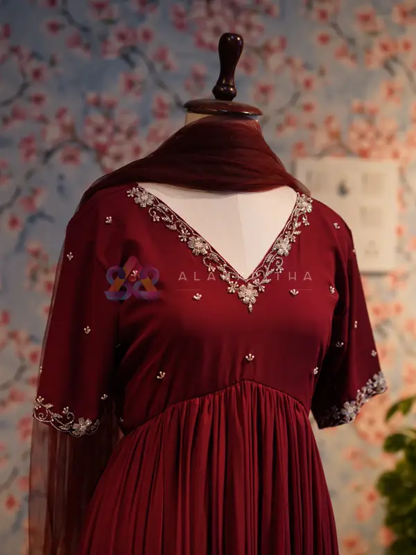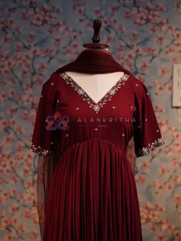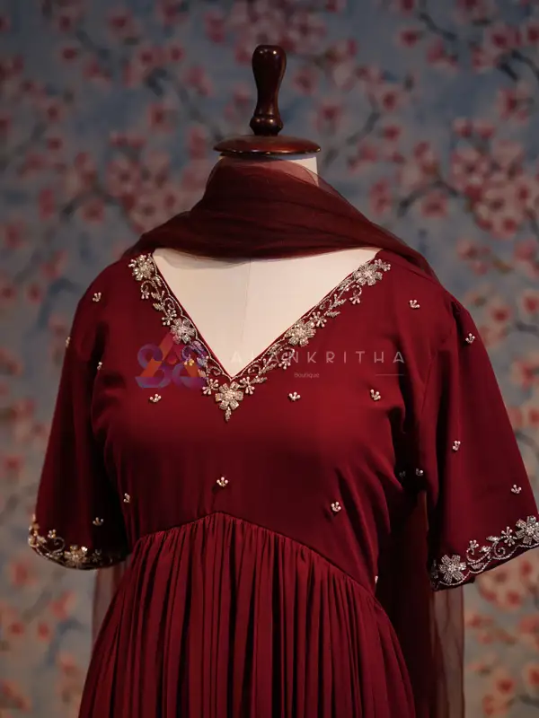 Step into timeless elegance with our Georgette Alia-Cut Anarkali, designed to flatter with its flowing silhouette and rich craftsmanship.