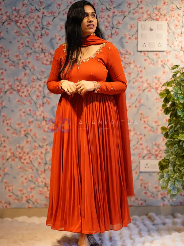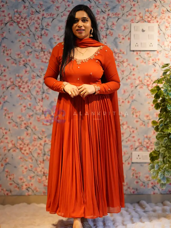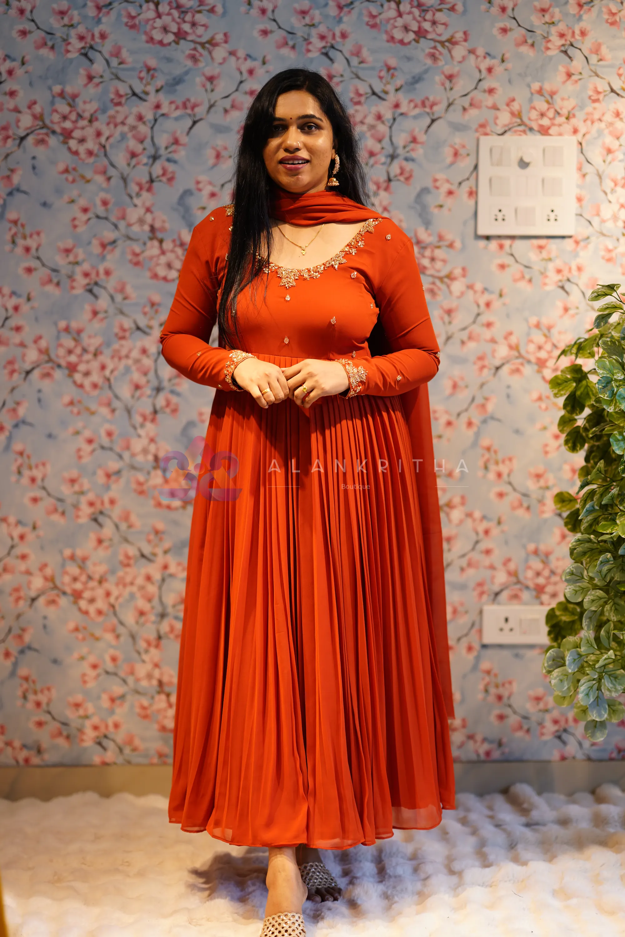 Opulent Hues: Rust Orange Pleated Anarkali with Hand-Embroidered Sleeves