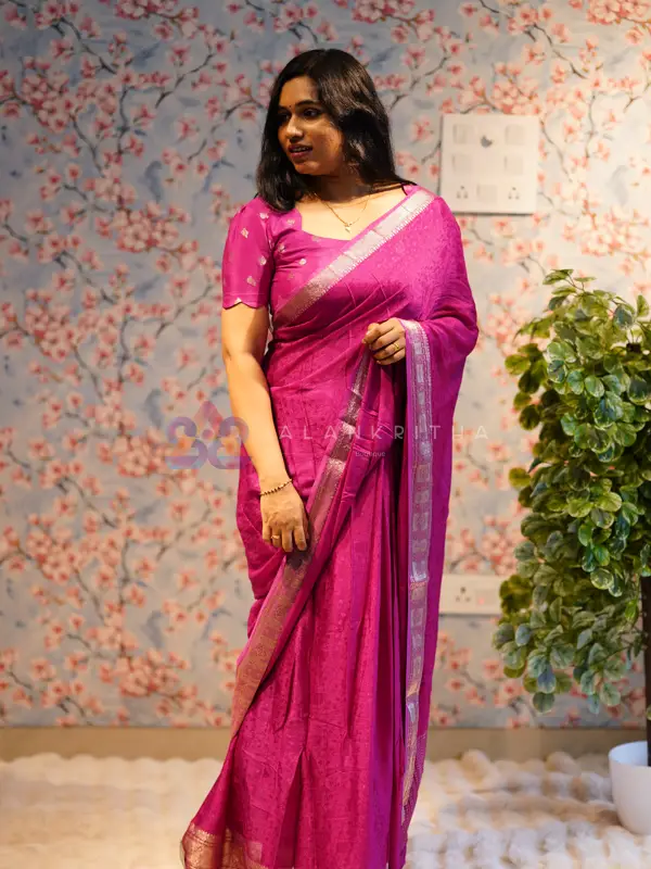 - Luxurious Blouse Fabric: The matching blouse is crafted from Viscose Georgette Silk, offering a subtle touch of glamour, superior comfort, and a perfect complement to the saree's flow.
