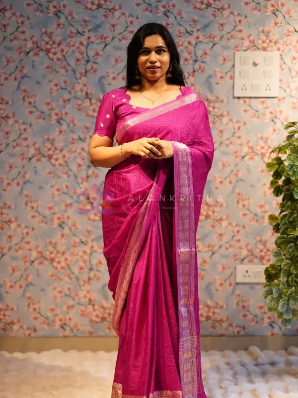 - Rich, Fluid Drape: Crafted from fine Viscose Georgette, the saree offers a soft sheen and a beautiful, fluid fall that drapes effortlessly, enhancing its graceful appeal.