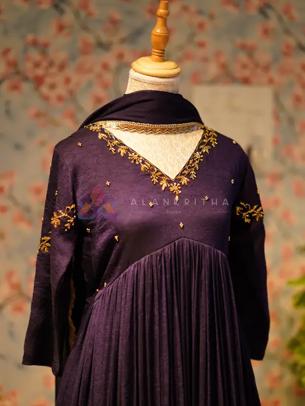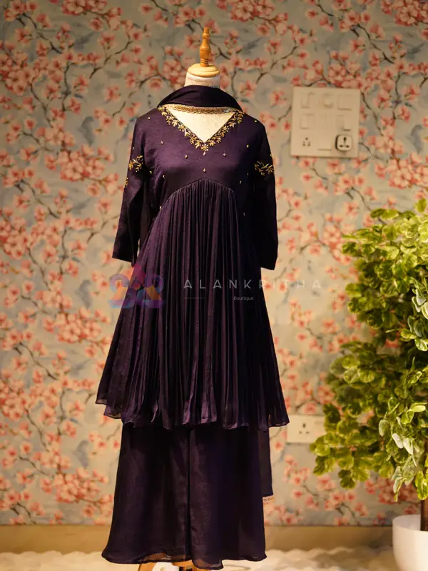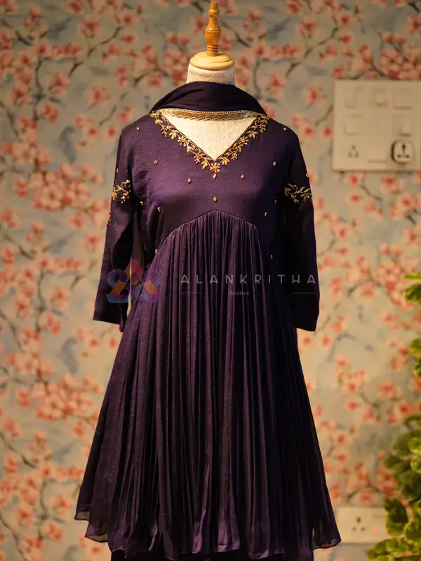Indulge in the rich texture and deep hues of our stunning Purple Vichitra Silk Alia-Cut Anarkali. This magnificent piece is designed to command attention, blending the opulence of the jewel-toned fabric with a contemporary, flattering silhouette.