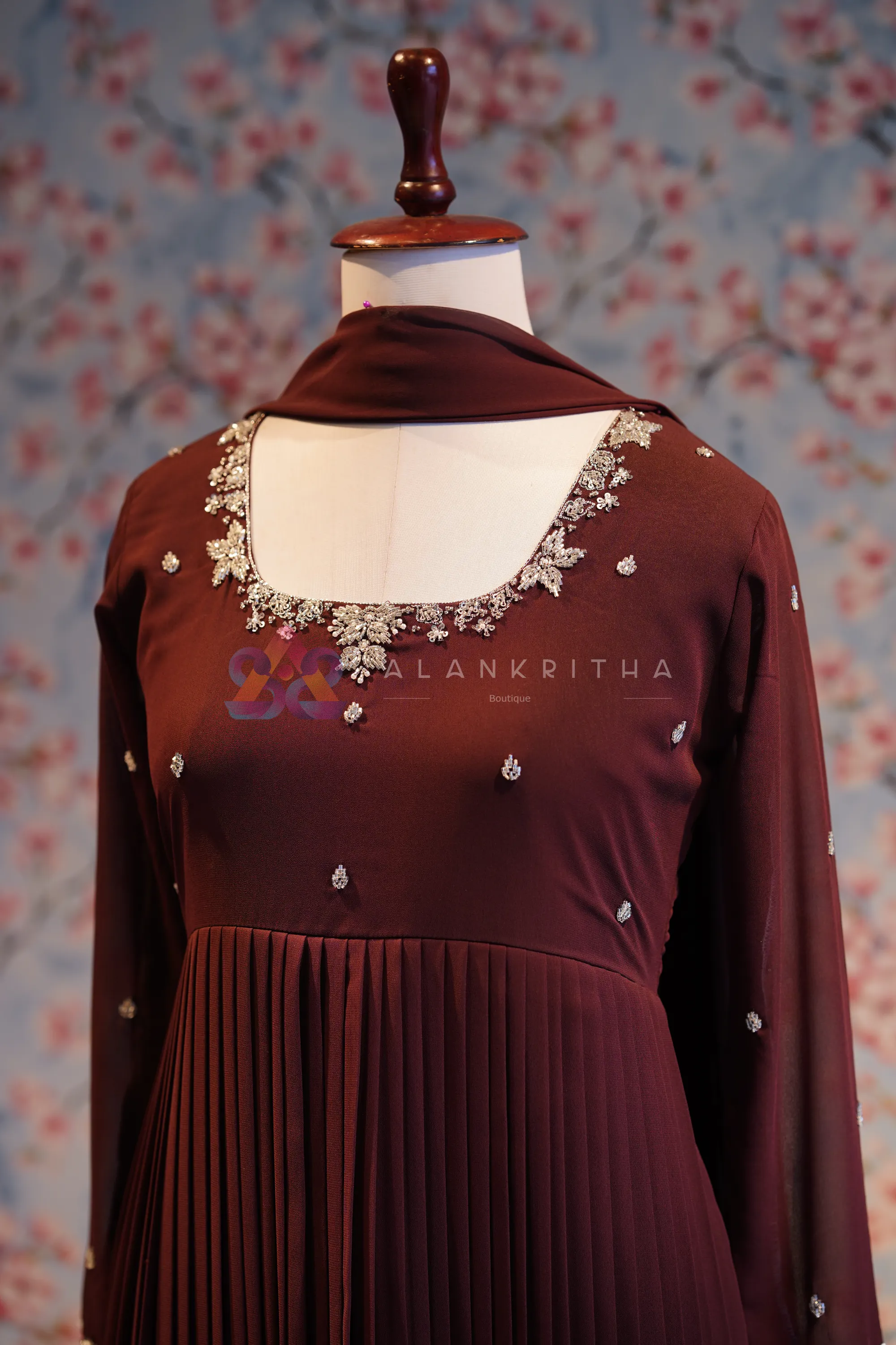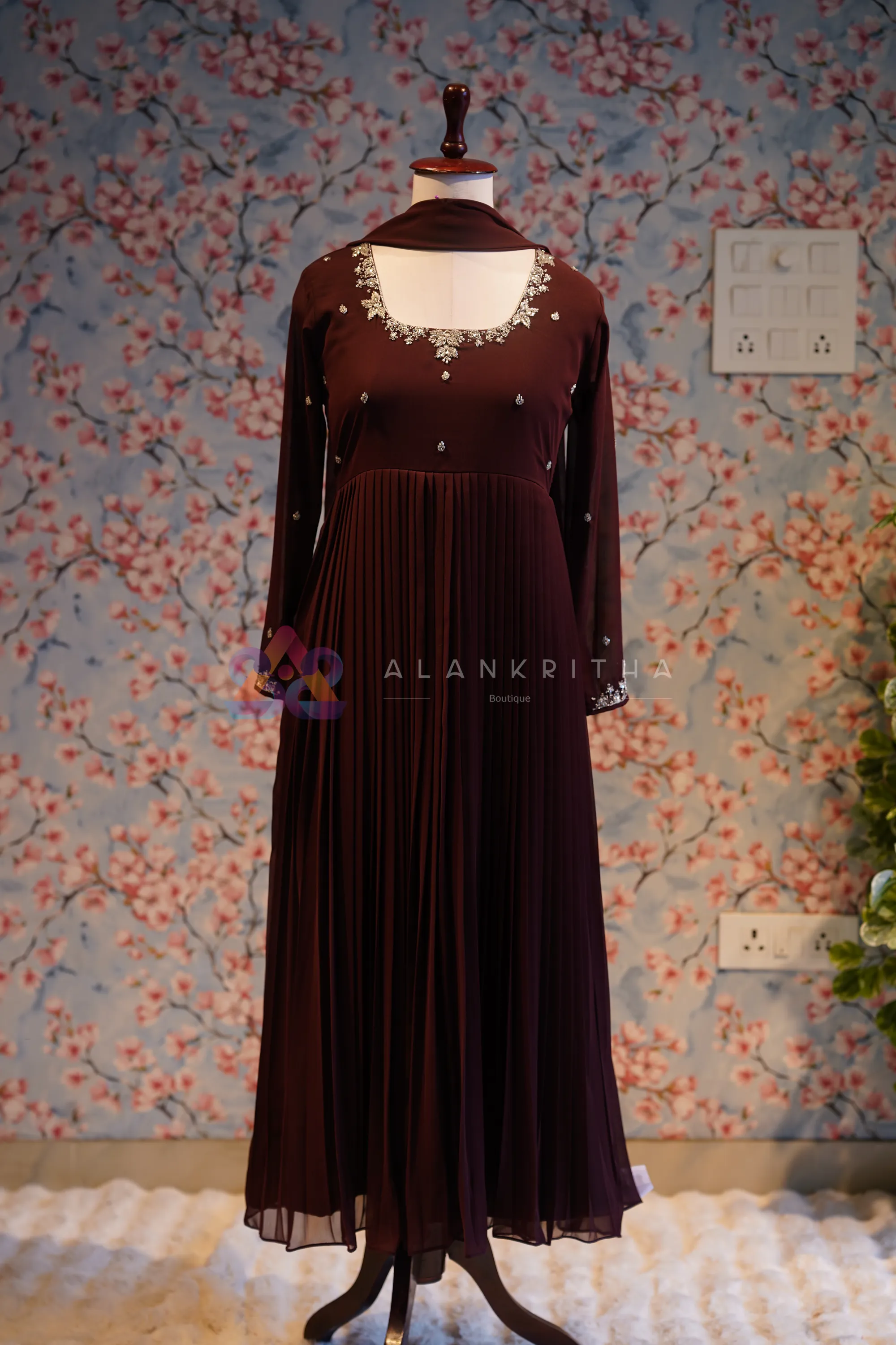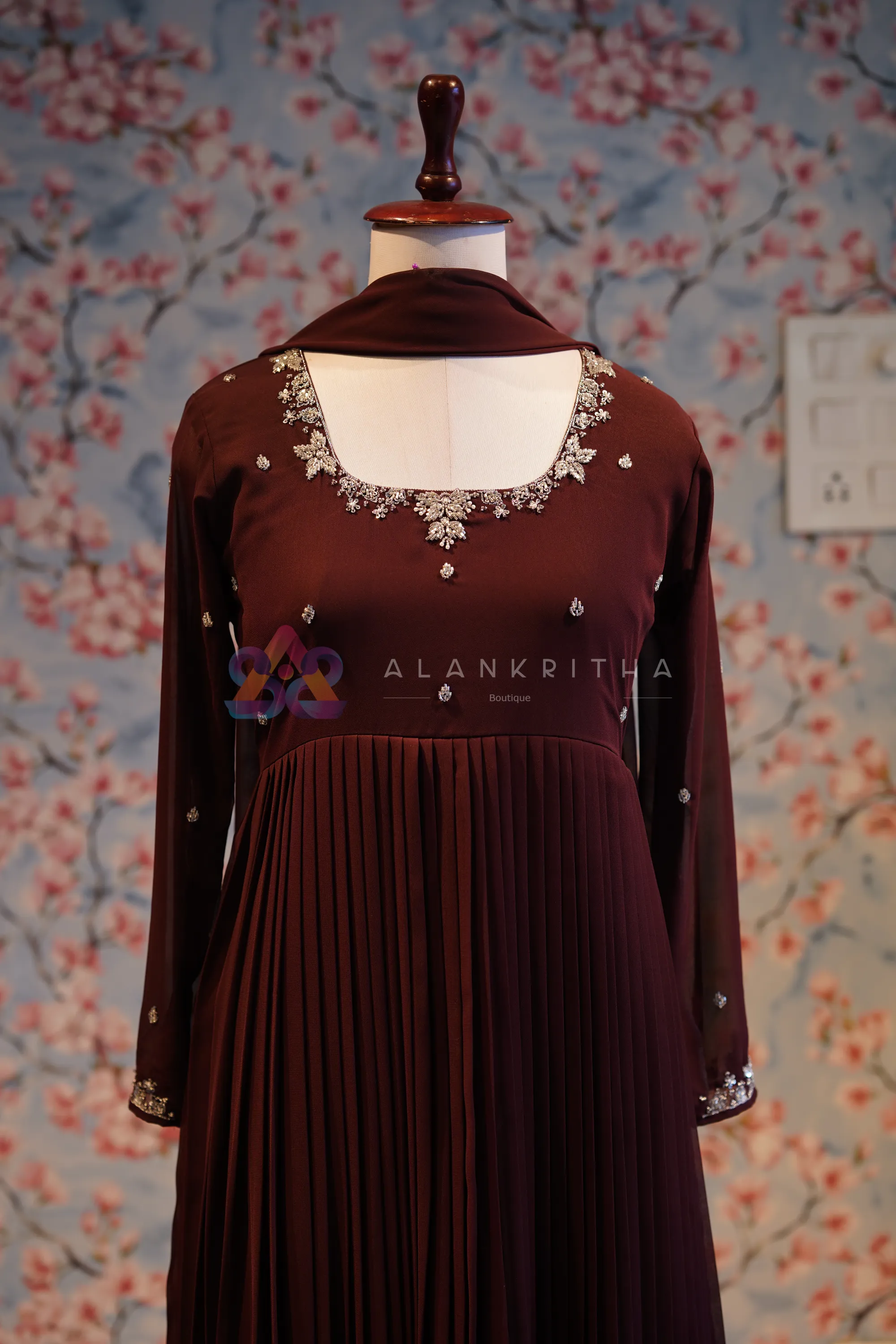 Brown Pleated Anarkali with Hand-Embroidered Sleeves