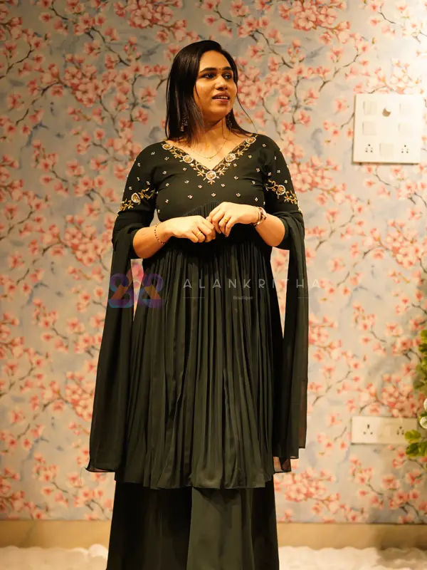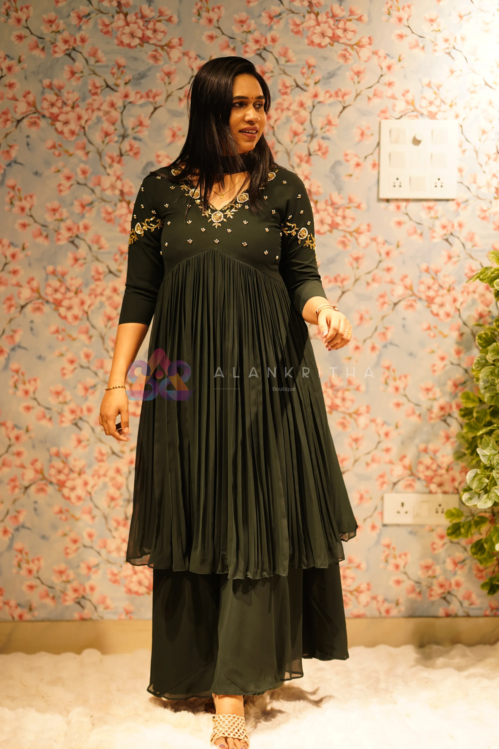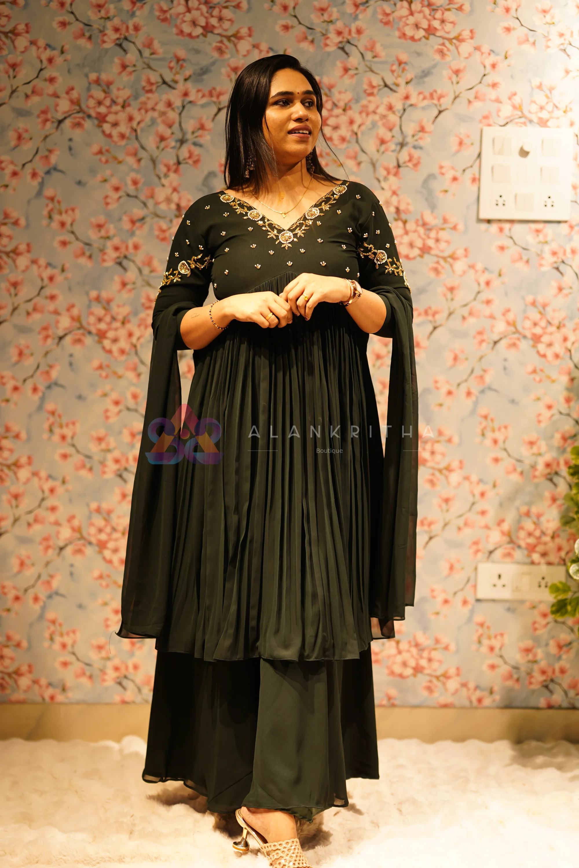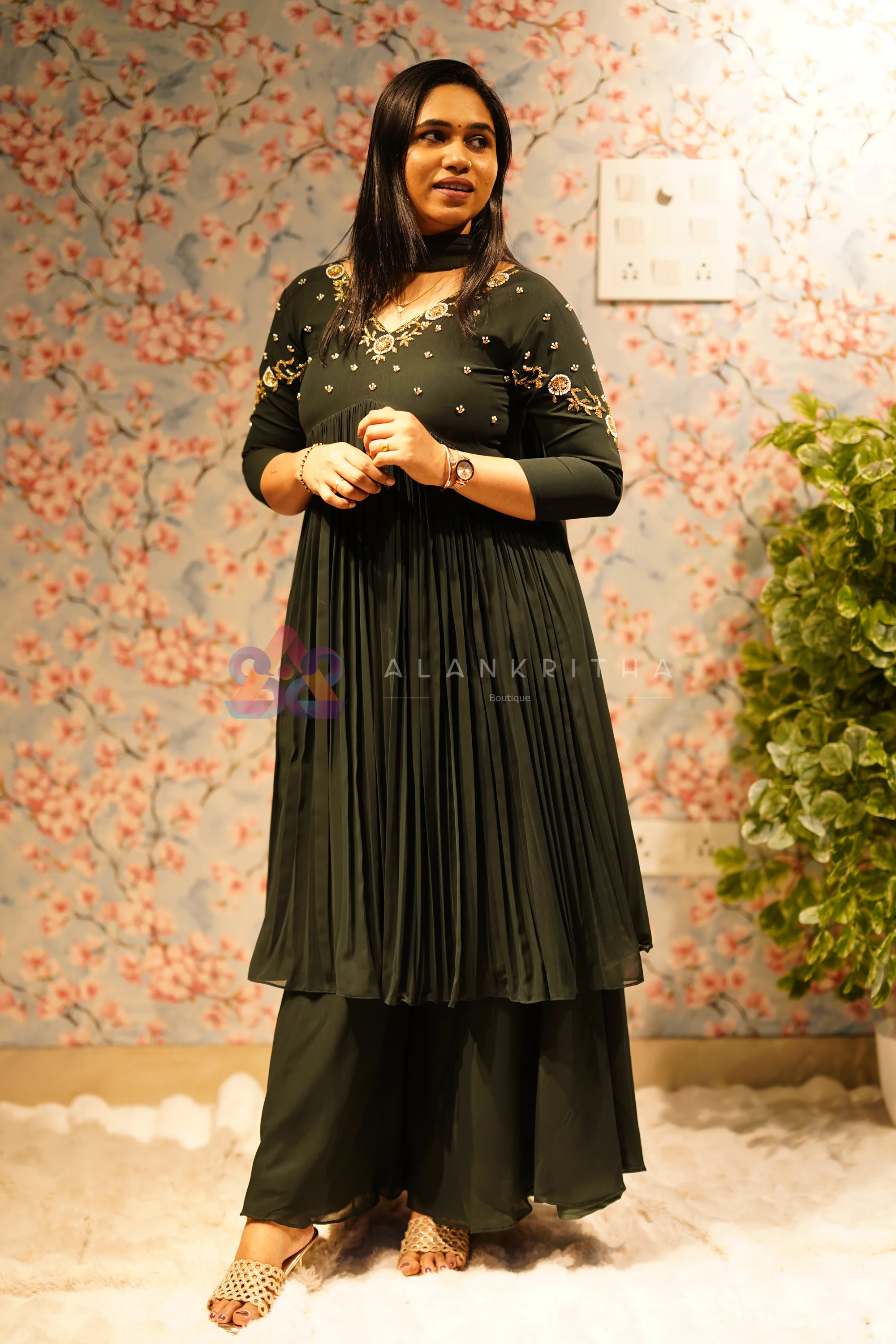 Emerald Depth: Dark Green Pleated Anarkali with Hand-Embroidered Sleeves