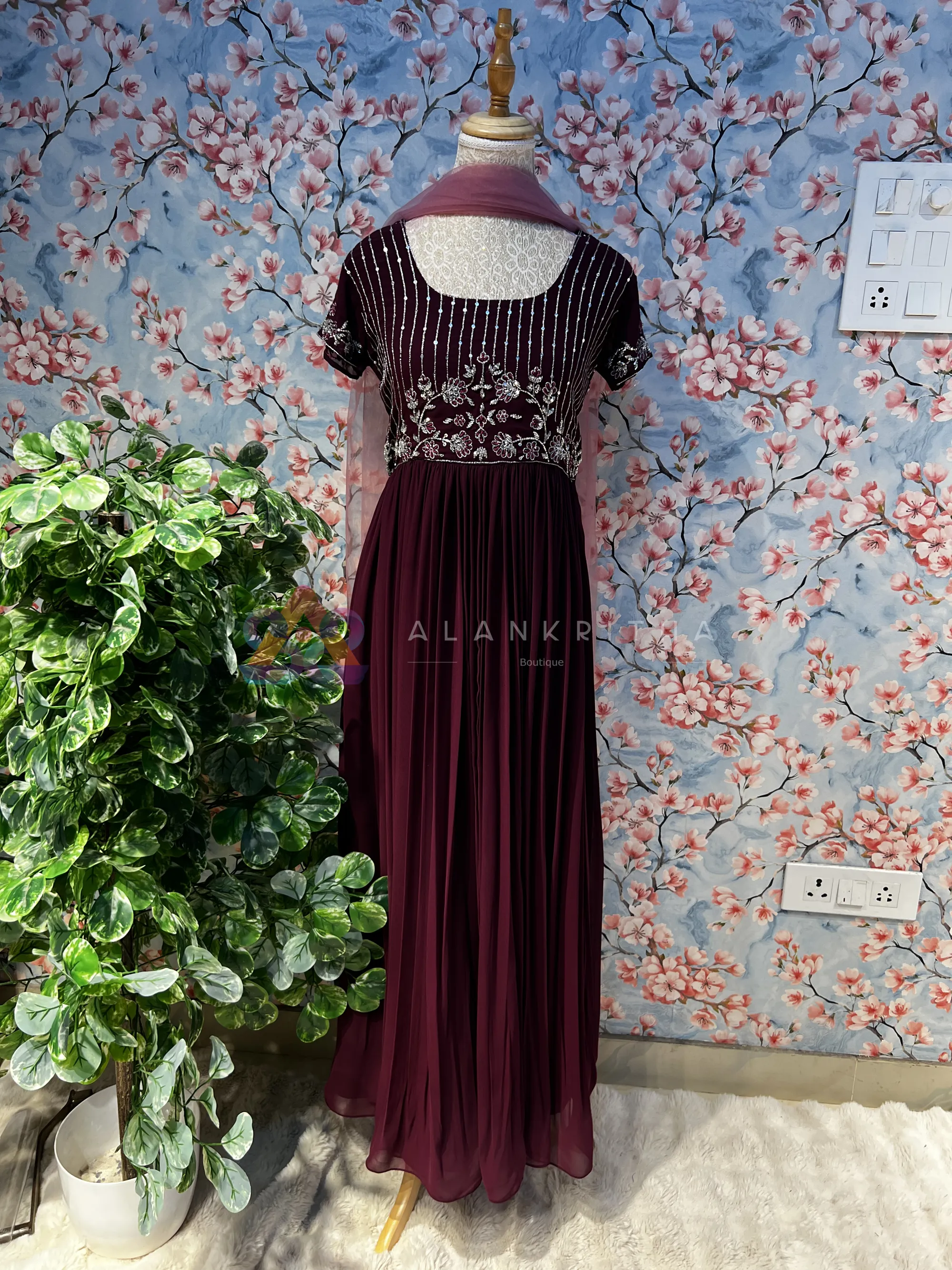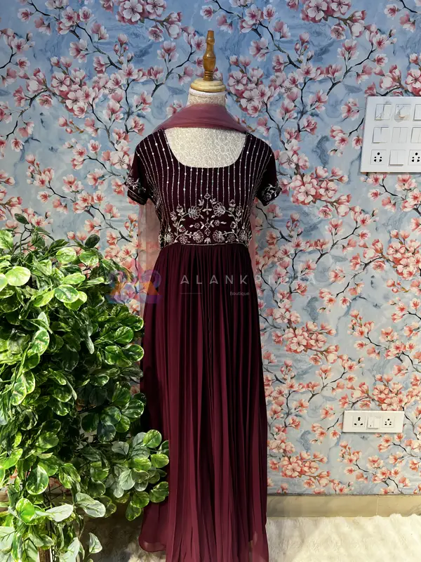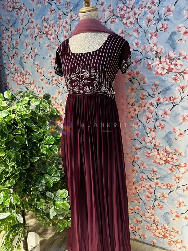Step into a world of timeless luxury with our Wine Pleated Anarkali. This ensemble is a celebration of deep, romantic hues and artisanal craftsmanship, featuring a breathtaking hand-embroidered yoke and a graceful, flowing silhouette.
