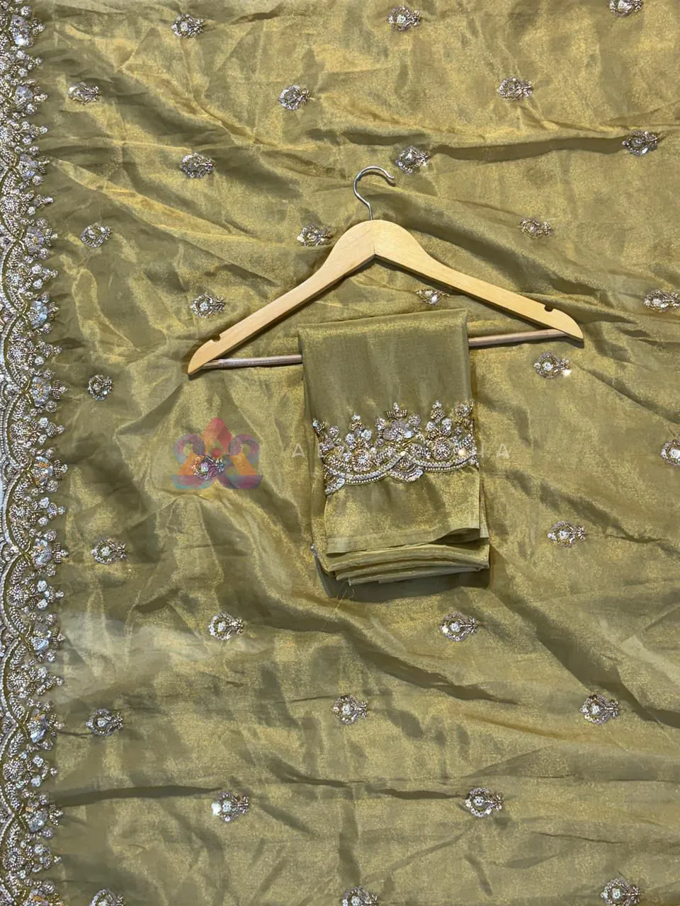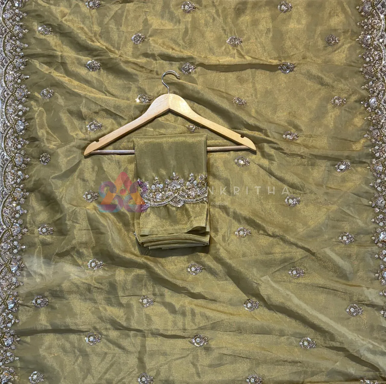 Gilded Radiance: Pure Tissue Silk Saree with Original Gold Beadwork