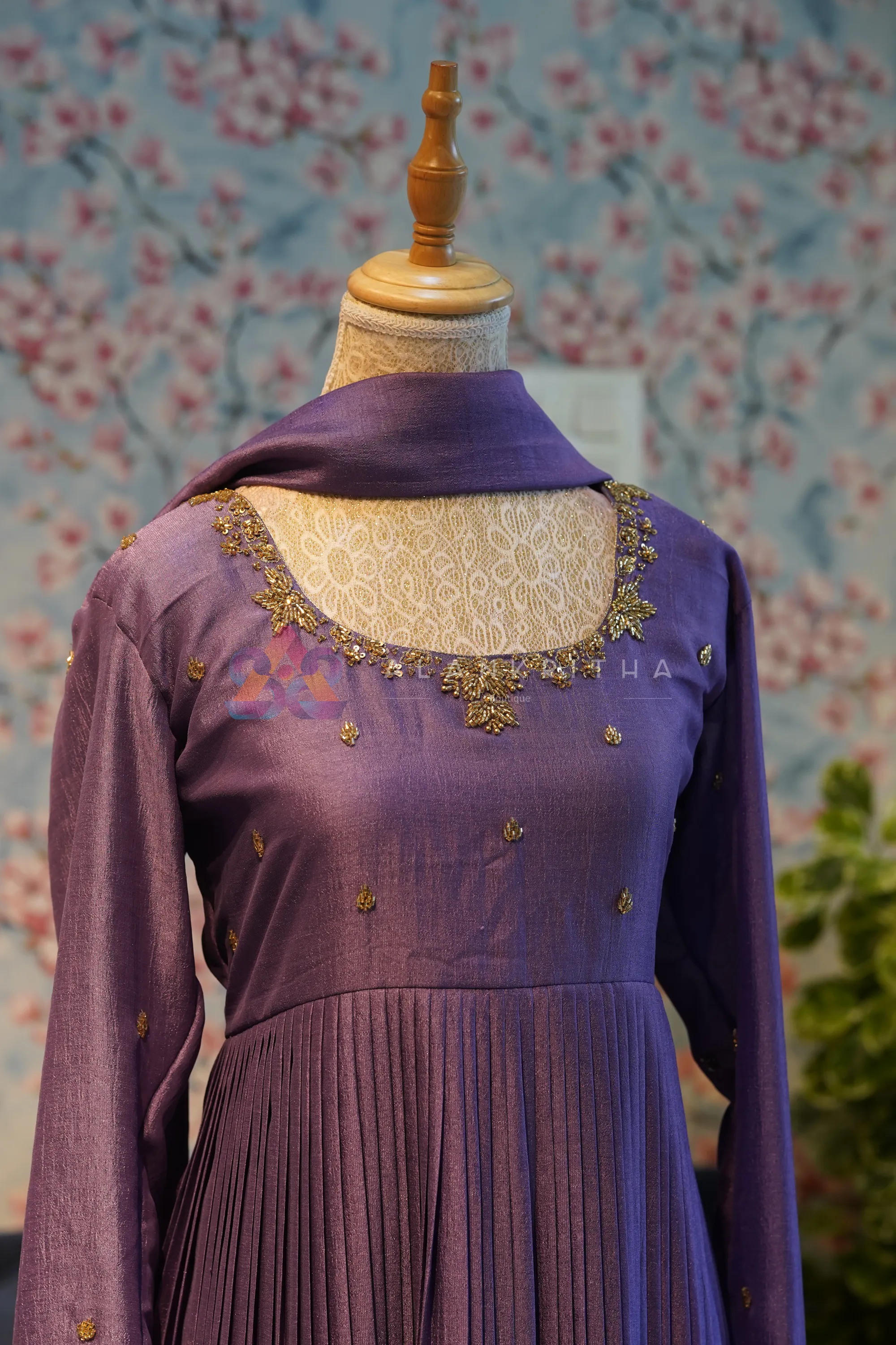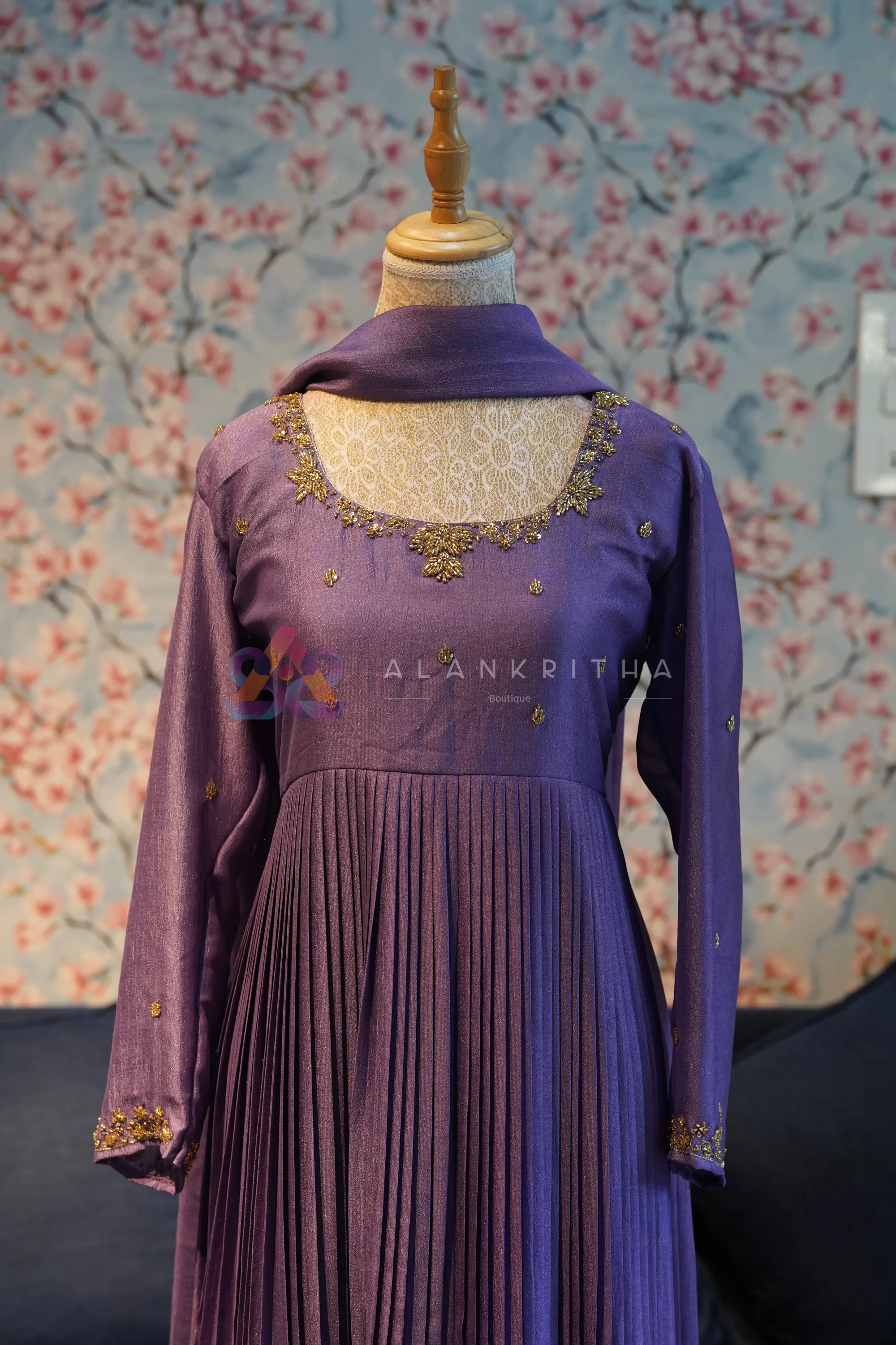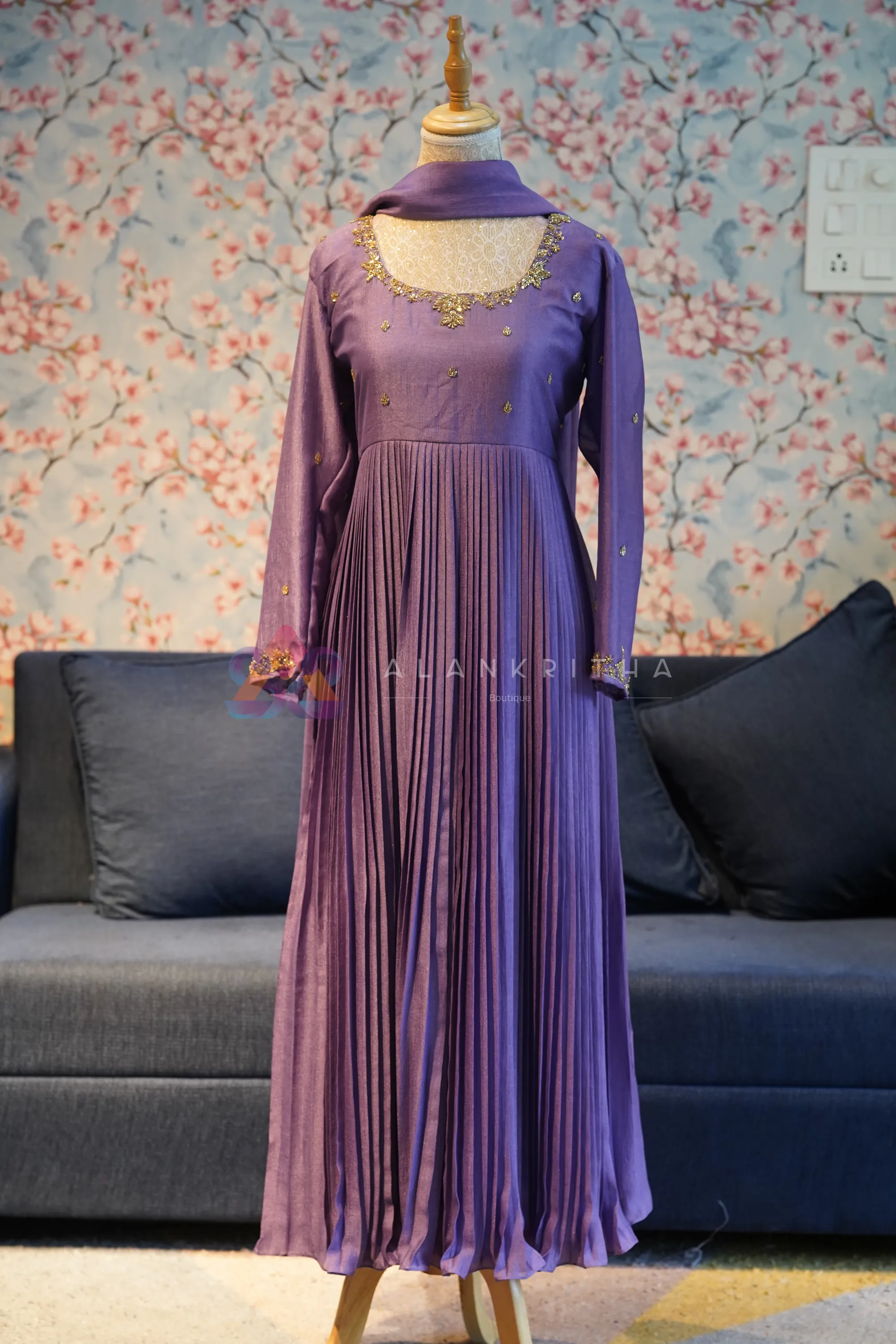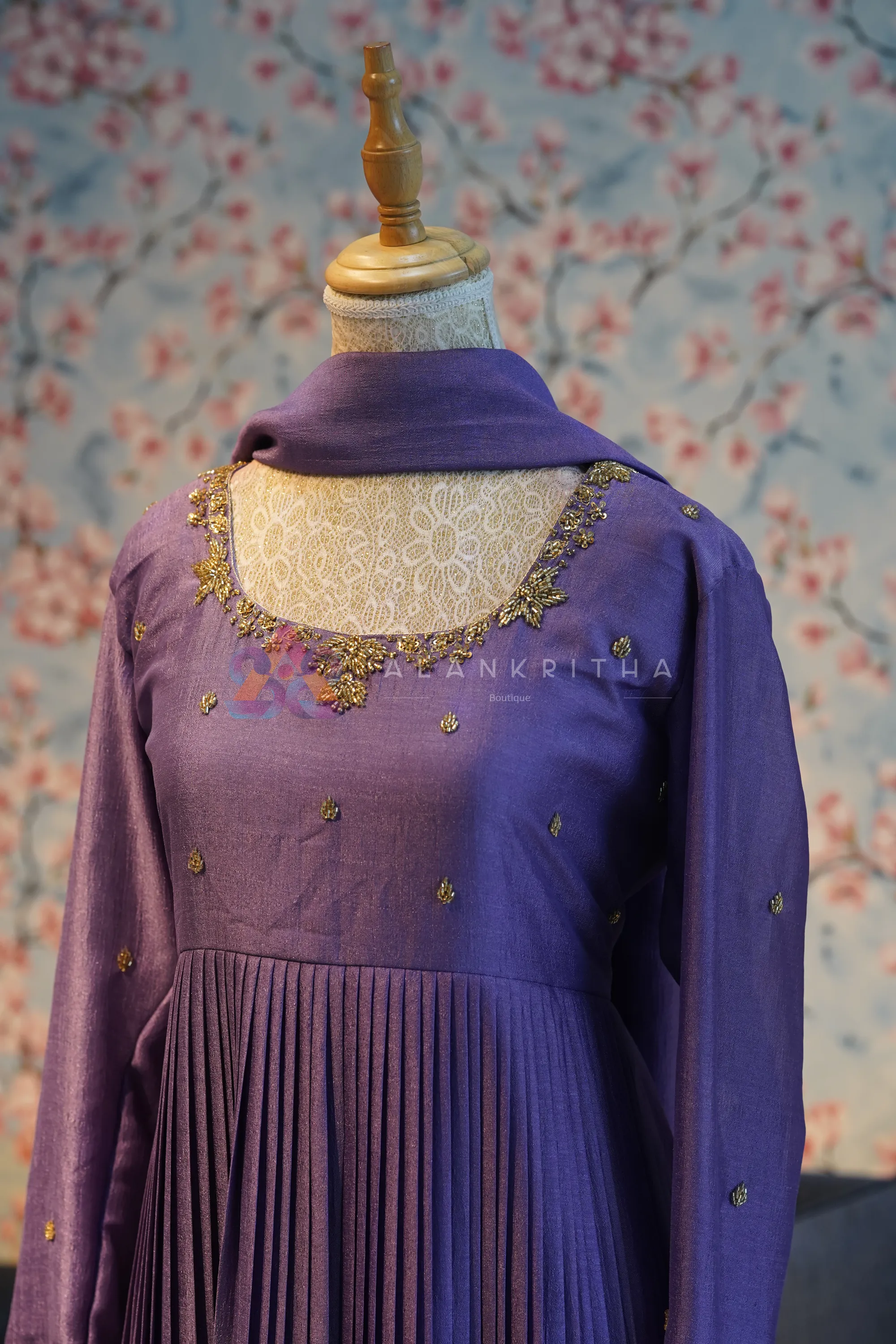 Dark Lavender Pleated Anarkali with Hand-Embroidered Sleeves
