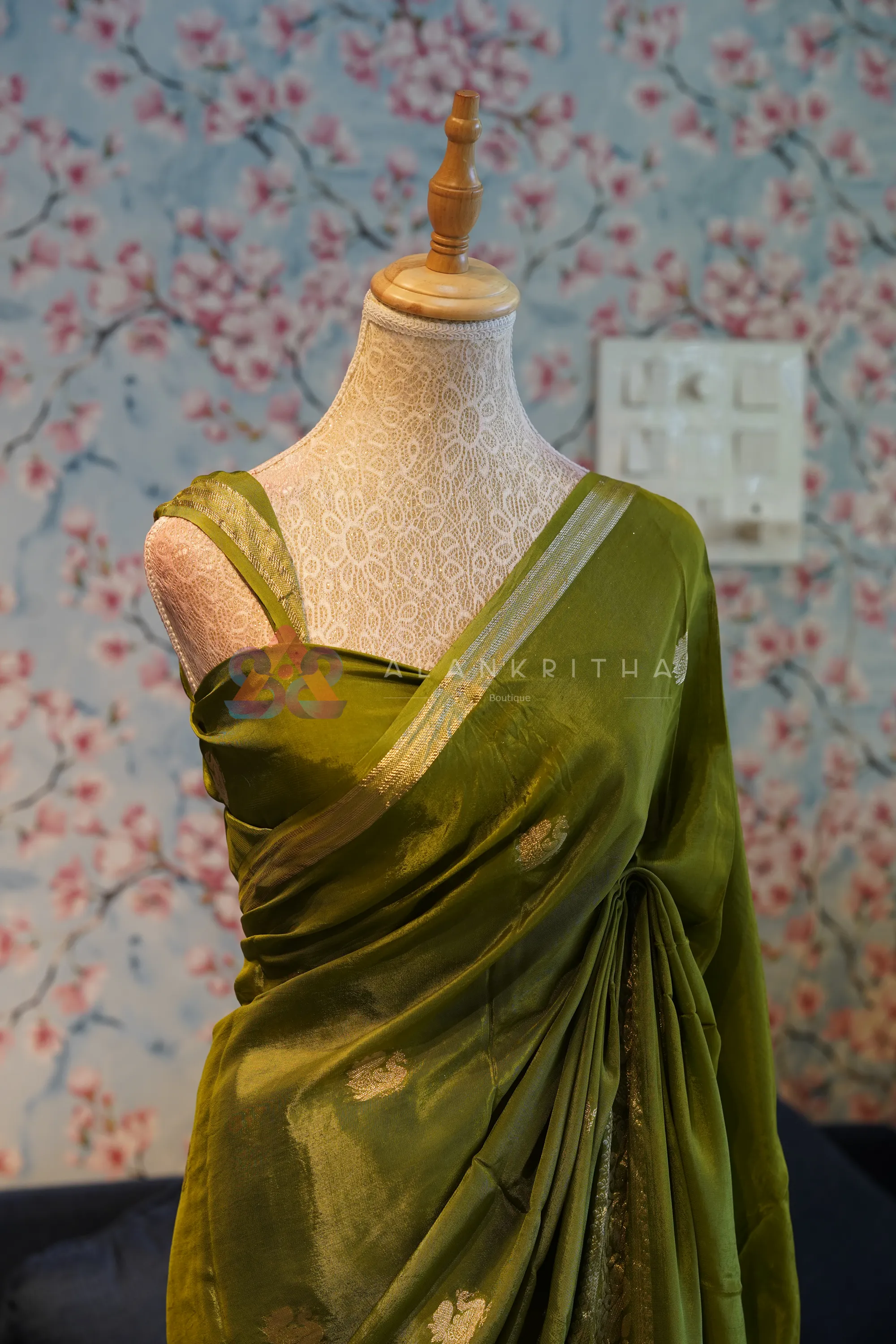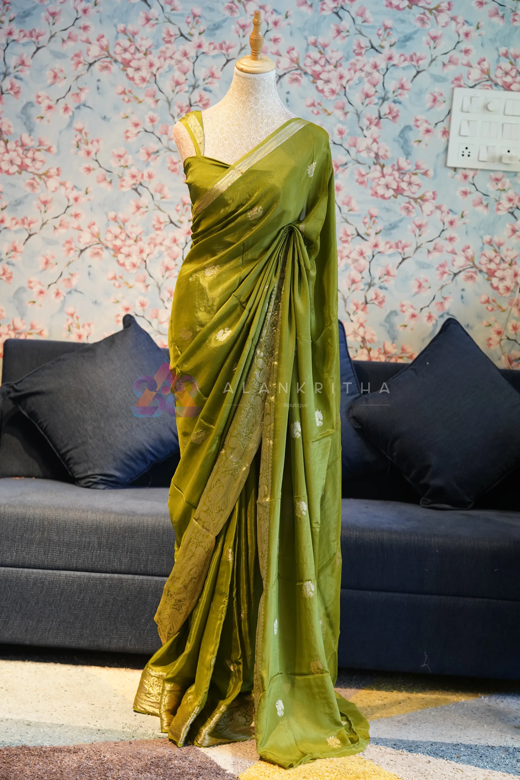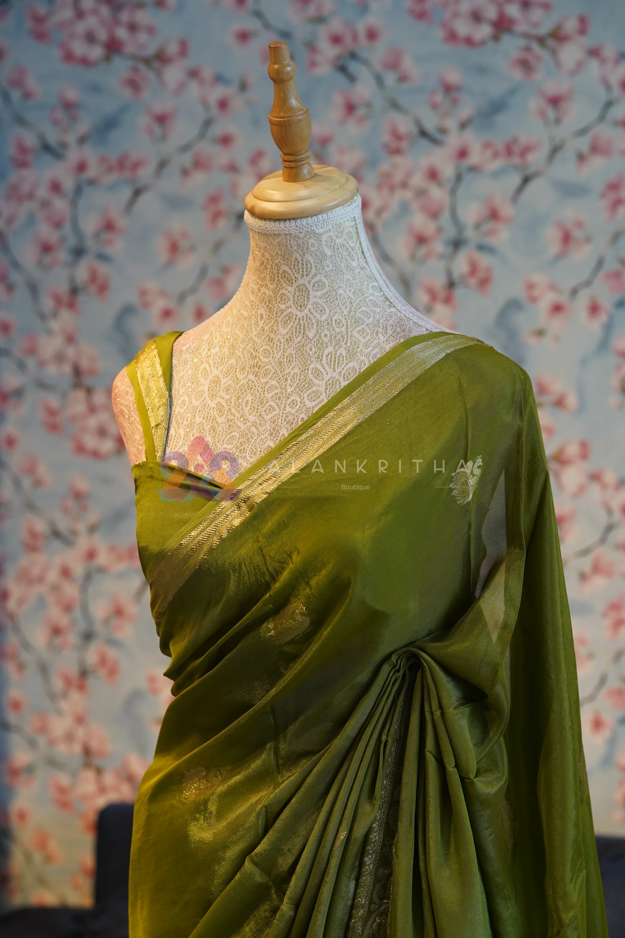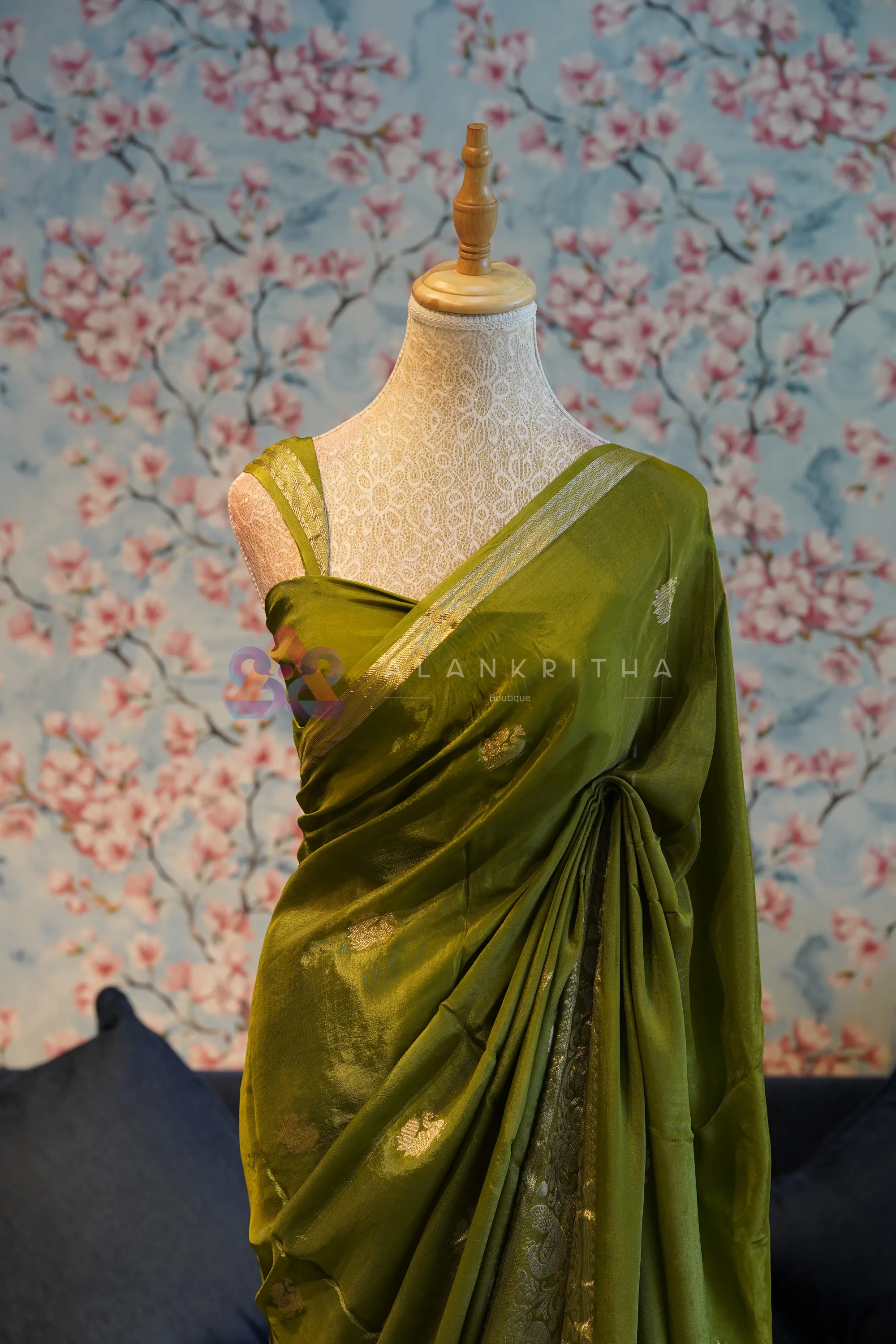 Inspired by the fresh tones of nature and crafted for high-end celebrations, this Olive Green Saree showcases the perfect blend of traditional weaving and contemporary luster.