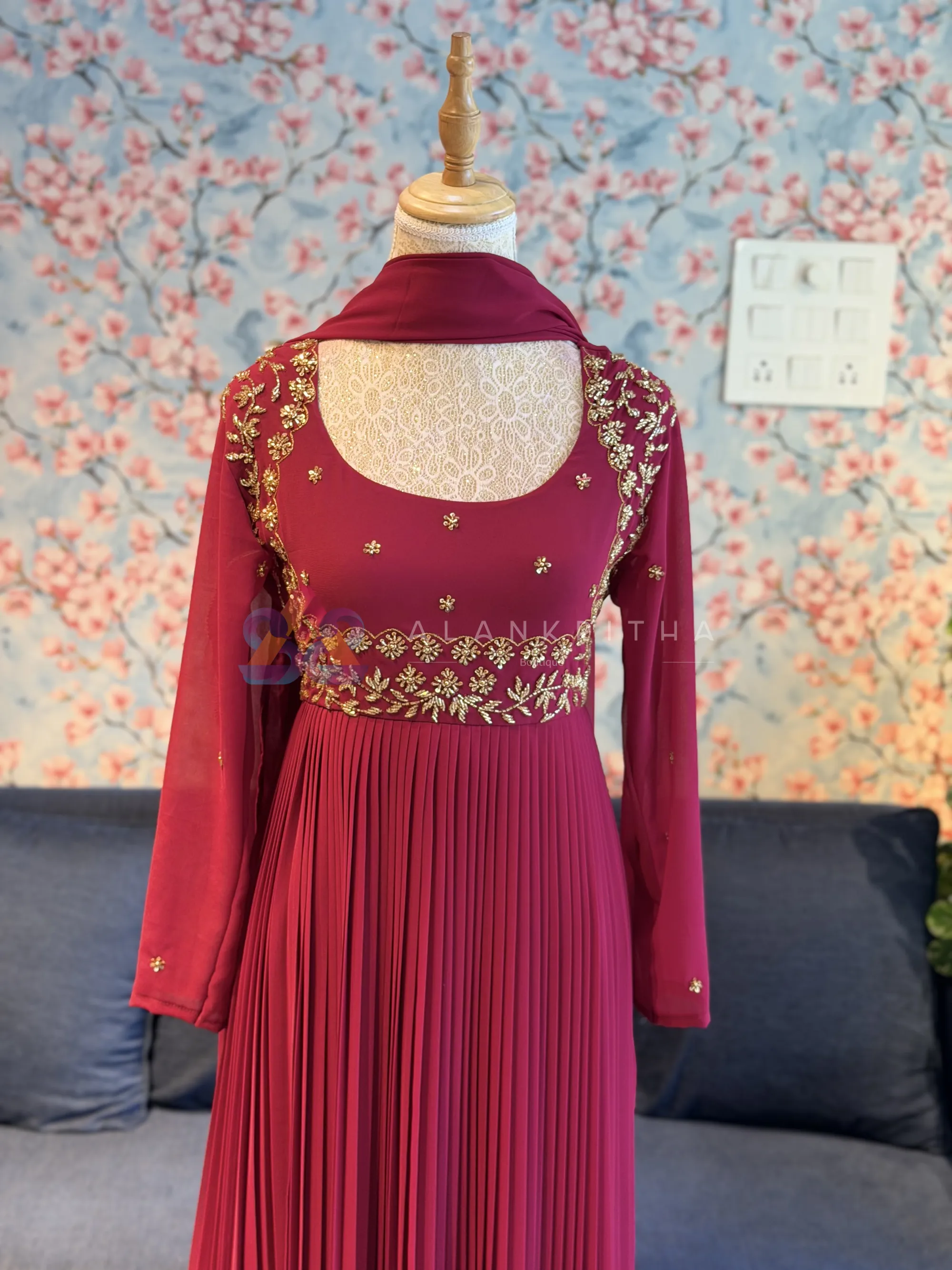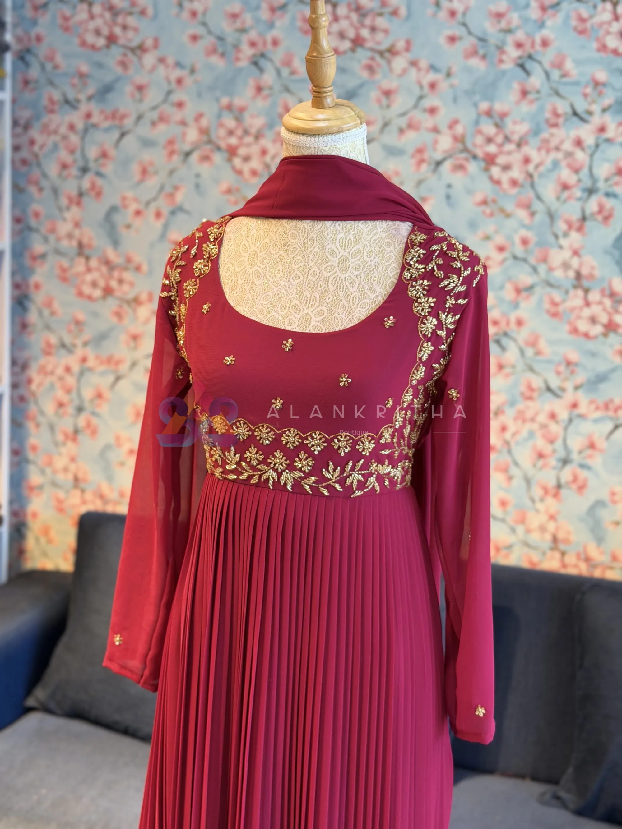 Indulge in the regal charm of our Wine Pleated Anarkali, a stunning ensemble that marries a deep, sophisticated hue with the intricate beauty of golden artistry. Designed for a silhouette that is both structured and flowing, this piece is the epitome of boutique luxury.