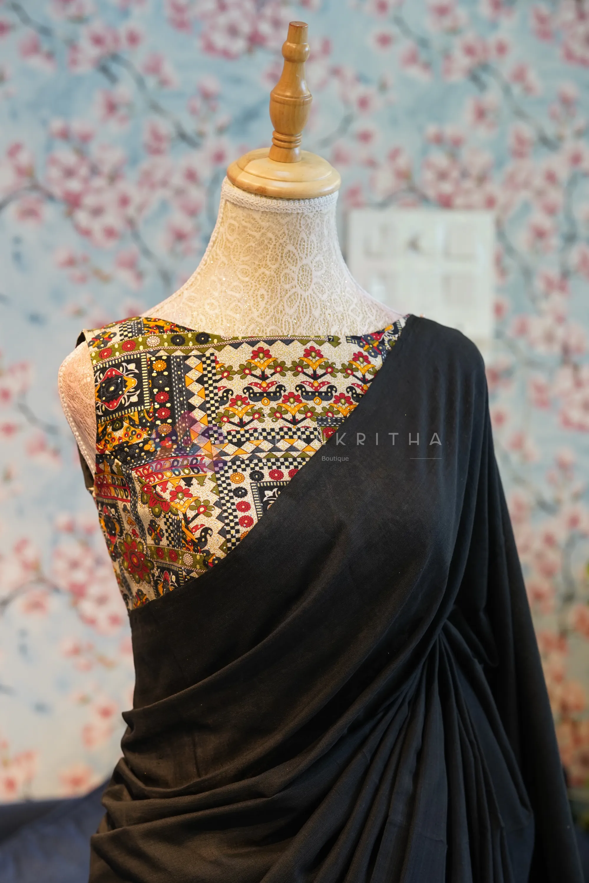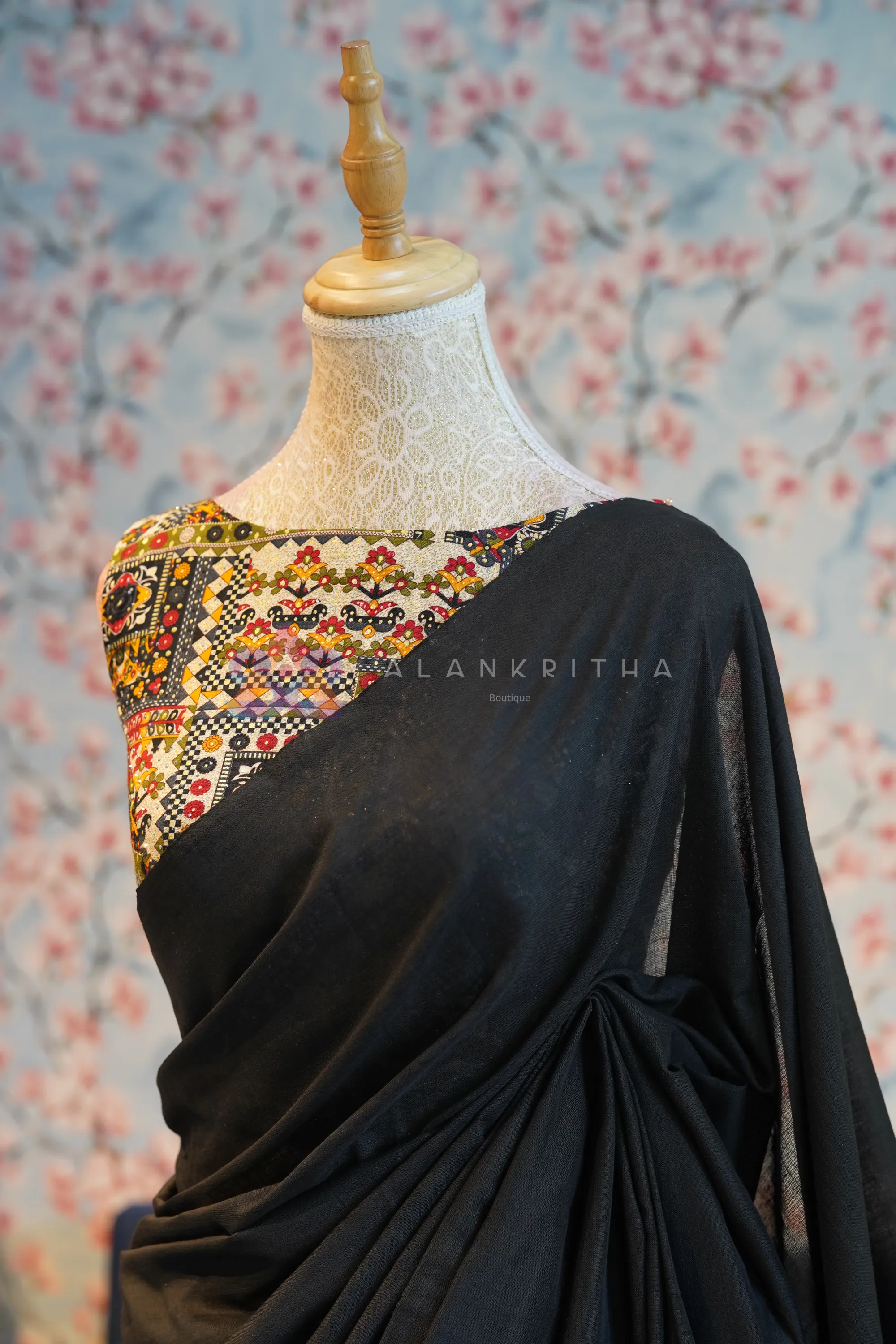 Solid Ebony Body: The saree features a rich, solid black body that provides a sleek and sophisticated canvas for any occasion.