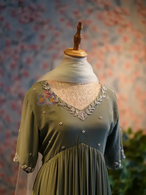 - Exclusive Custom Shade – Pastel Green: This Alia-Cut Suit has been reimagined in a soothing Pastel Green hue, bringing a soft, refreshing charm to the bold elegance of the original red design. The delicate color adds a serene, graceful appeal perfect for daytime festivities. Matching Net Dupatta: Paired with a lightweight net dupatta in the same pastel green tone, beautifully finished with subtle embroidery, lending an airy and ethereal touch to the ensemble. Intricate Hand Embroidery: The hand-embroidered detailing has been delicately adjusted to complement the pastel base, allowing the craftsmanship to shine with understated sophistication. Signature Alia-Cut Silhouette: The classic pleated Alia-cut pattern maintains its flattering structure, offering a blend of modern fit and flowing elegance.