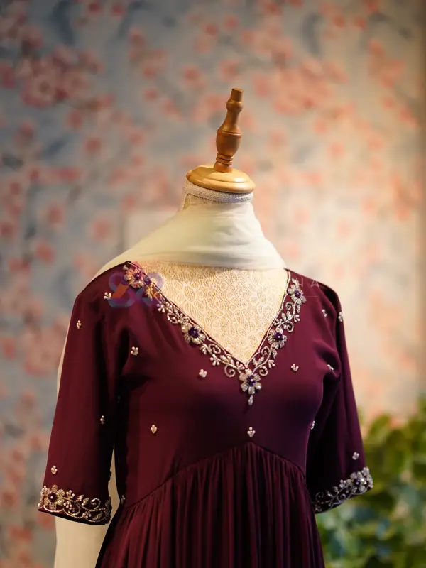 - Exclusive Custom Shade – Maroon: This Alia-Cut Suit is re-envisioned in a deep Maroon hue, offering a regal, refined alternative to the original crimson tone. The rich shade enhances the handcrafted embroidery, giving the ensemble a more luxurious and timeless appeal. Contrasting White Net Dupatta: Paired with a soft white net dupatta, creating a stunning visual balance against the maroon base. The dupatta is delicately finished with minimal detailing for a graceful, airy touch. Original Hand Embroidery: The intricate embroidery — featuring fine threadwork, sequins, and zari elements — has been retained exactly as in the original design to preserve its signature craftsmanship. Flattering Alia-Cut Silhouette: The elegant pleated Alia-cut structure ensures a beautifully fitted bodice with flowing volume below, adding movement and grace to every step.