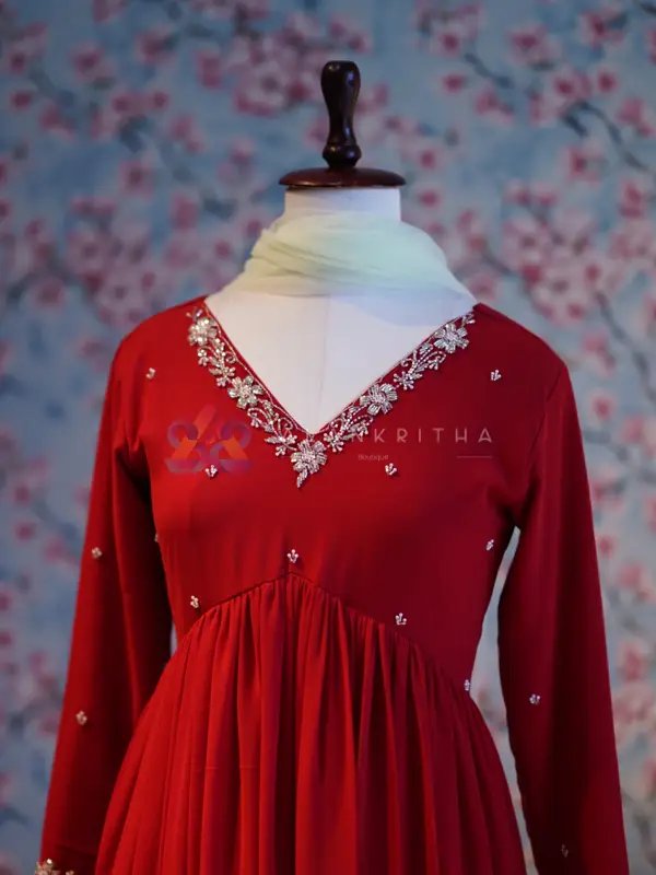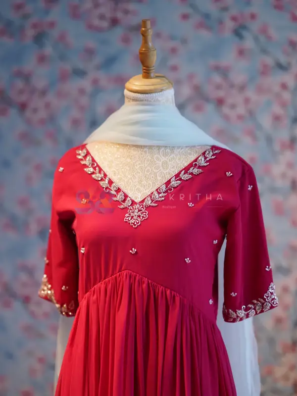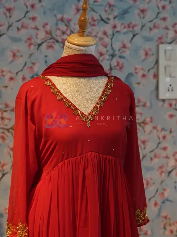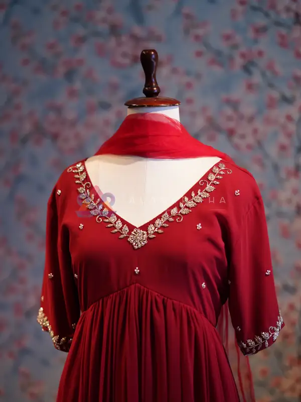 Color: Chilly Red Aliacut • Style: Aliacut Top with Dupatta • Neckline: V-neck with hand embroidery • Sleeves: Embroidered sleeve ends • Work: Pure hand embroidery • Fit: Comfortable and flowy silhouette Perfect for those who love minimal elegance with handcrafted detailing.