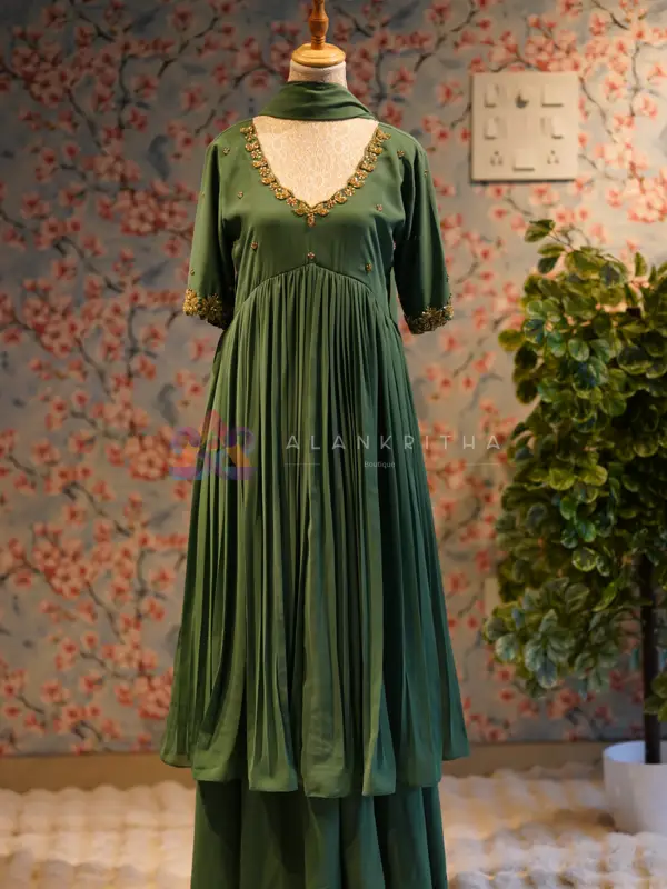 Elegant deep olive green aliacut outfit featuring intricate golden embroidery on both sleeve ends and neckline. Designed with a flattering V-neck for a graceful look. The outfit comes with a beautifully gathered aliacut pattern , paired with a matching skirt and dupatta.