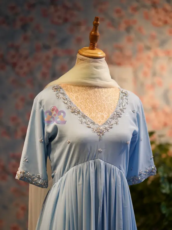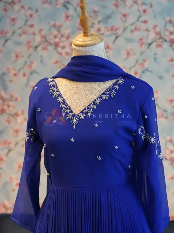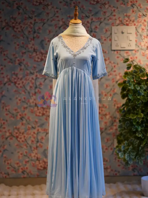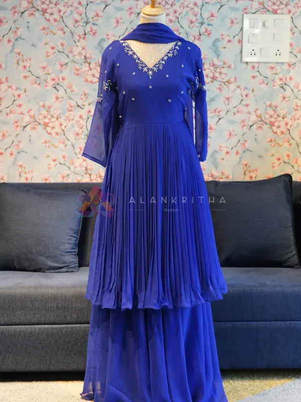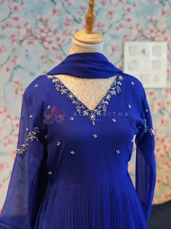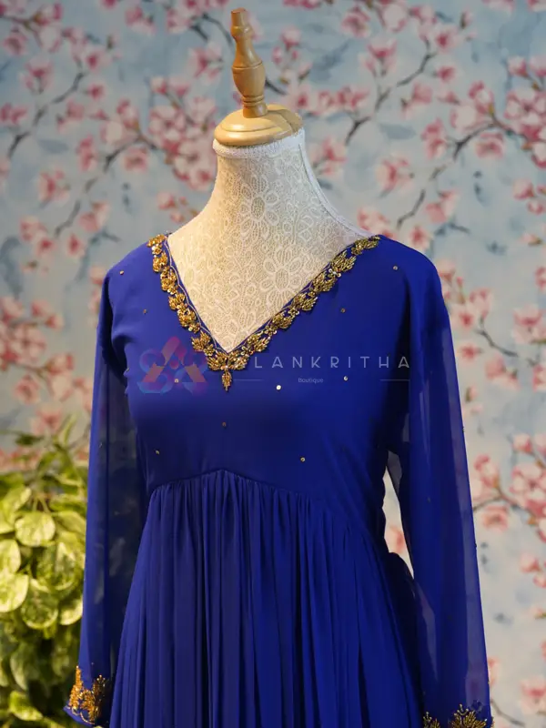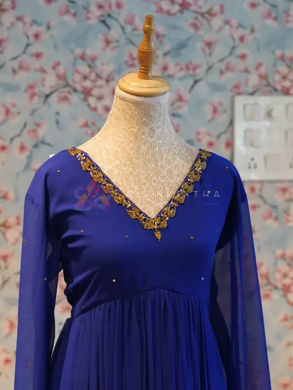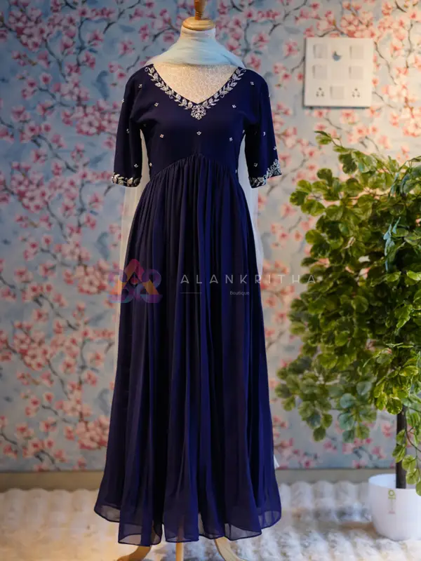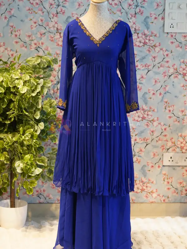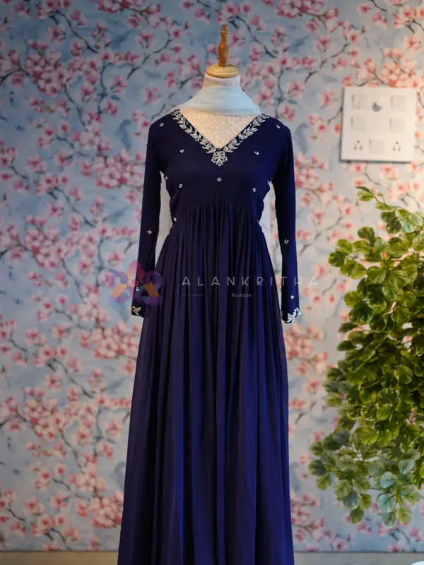 Make a graceful statement with this stunning royal blue aliacut dress, designed with a flowy gathered silhouette that offers both elegance and comfort. The rich hue enhances its premium appeal, making it perfect for festive and evening wear. The dress features a flattering V-neckline highlighted with delicate embroidery, paired with full sleeves finished with matching embroidered detailing at the sleeve ends. The subtle embellishments add a refined touch without overpowering the look.