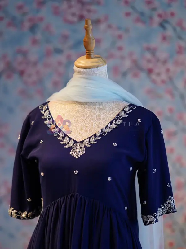 Elevate your ethnic wardrobe with this elegant navy blue A-line (aliacut) set, designed to offer both comfort and timeless style. Crafted in a flowy gathered silhouette, this outfit beautifully enhances your overall look with its graceful fall. The design features a flattering V-neckline adorned with intricate silver embroidery, complemented by matching silver work on the sleeve ends. The subtle detailing adds just the right amount of shimmer, making it perfect for both festive occasions and evening wear.