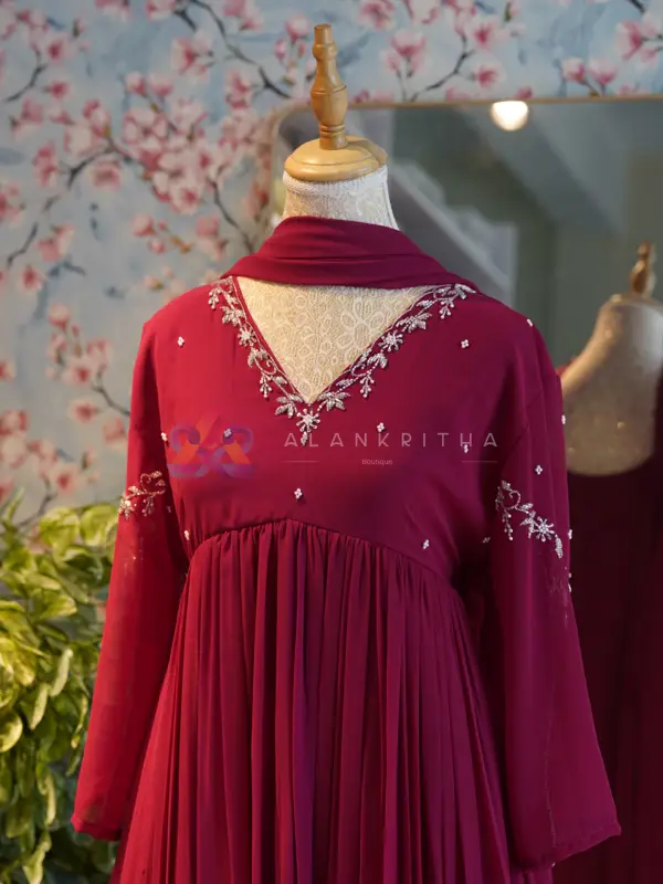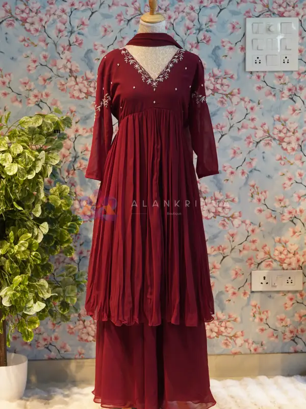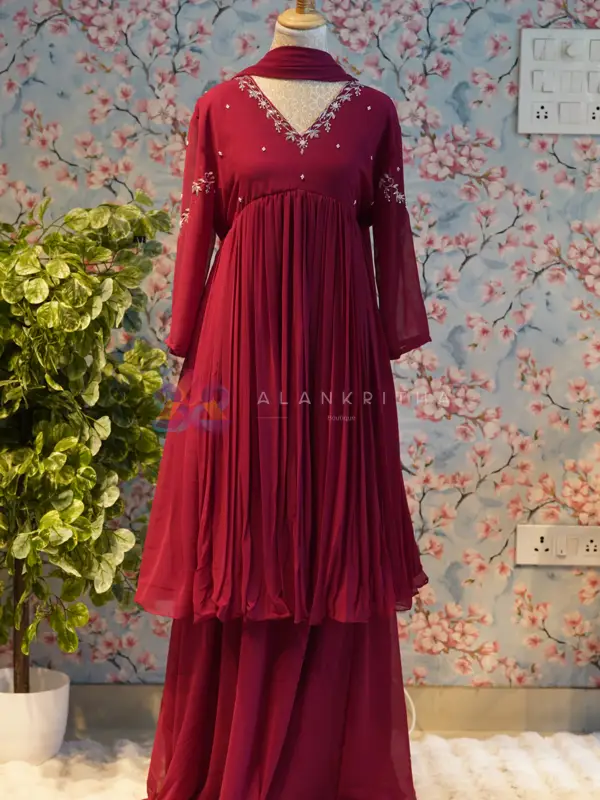 Wine Red Aliacut with Skirt & Dupatta Add a touch of elegance to your wardrobe with this stunning wine red aliacut set, designed to offer a perfect blend of grace and comfort. The rich, deep tone enhances its festive appeal, making it an ideal choice for special occasions and celebrations. The outfit features a beautifully gathered A-line (aliacut) top with a flattering V-neckline adorned with delicate embroidery. Subtle embroidered motifs are placed across the bodice and sleeves, while the sleeve ends are finished with matching embroidery, adding a refined touch. Paired with a coordinated skirt and dupatta, this set creates a complete and effortlessly elegant look.