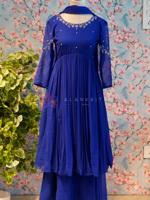 Royal Blue Aliacut with Skirt & Dupatta Set Elevate your ethnic style with this elegant royal blue aliacut set, designed for a graceful and flattering look. The outfit features a flowy gathered A-line silhouette that adds movement and sophistication. Designed with a stylish boat neckline, the top is beautifully enhanced with intricate embroidery on the neckline and sleeve ends, adding a refined festive touch. The subtle detailing perfectly complements the rich royal blue shade. Paired with a coordinated skirt and dupatta, this set creates a complete and effortlessly elegant ensemble suitable for festive occasions and special gatherings.