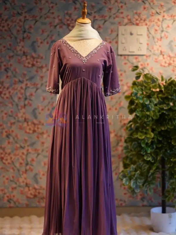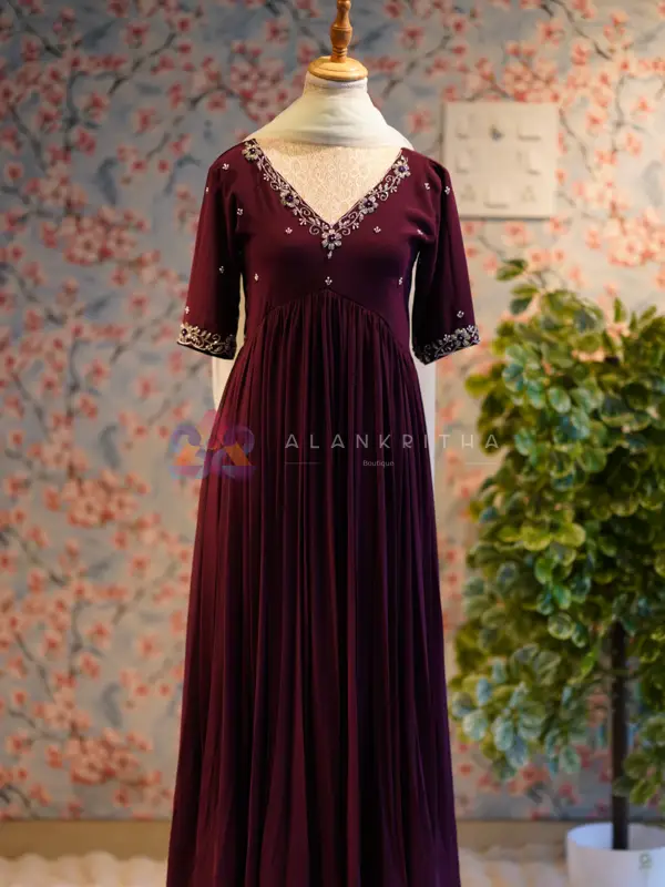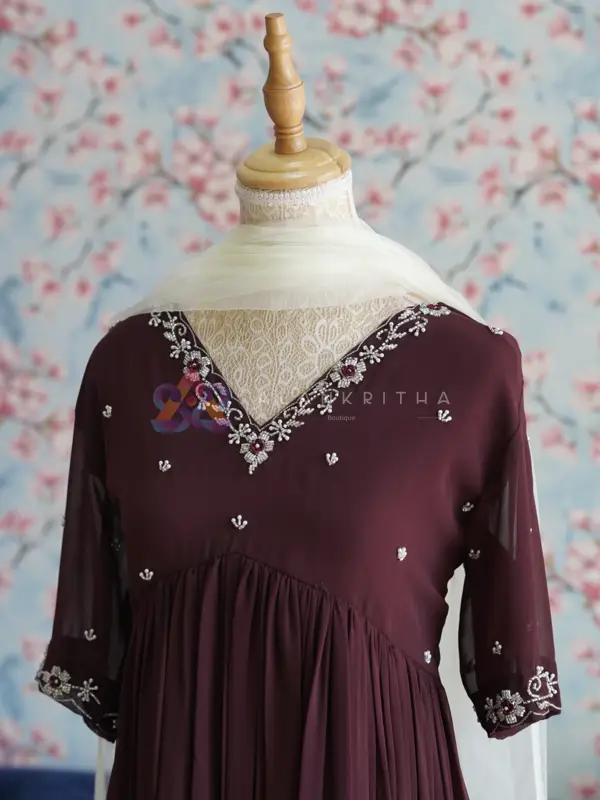 Details: • Color: Brownish Maroon • Style: Aliacut Top with Skirt and Dupatta • Neckline: V-neck with intricate hand embroidery • Sleeves: Embroidered sleeve ends • Work: Pure hand embroidery • Fit: Comfortable and flowy silhouette Perfect for those who love minimal elegance with beautiful handcrafted detailing, making it ideal for both everyday wear and special occasions.