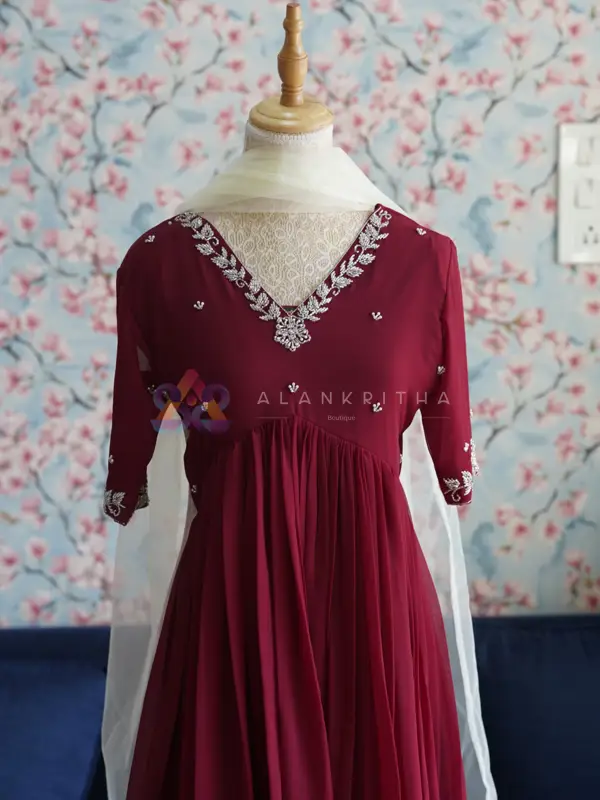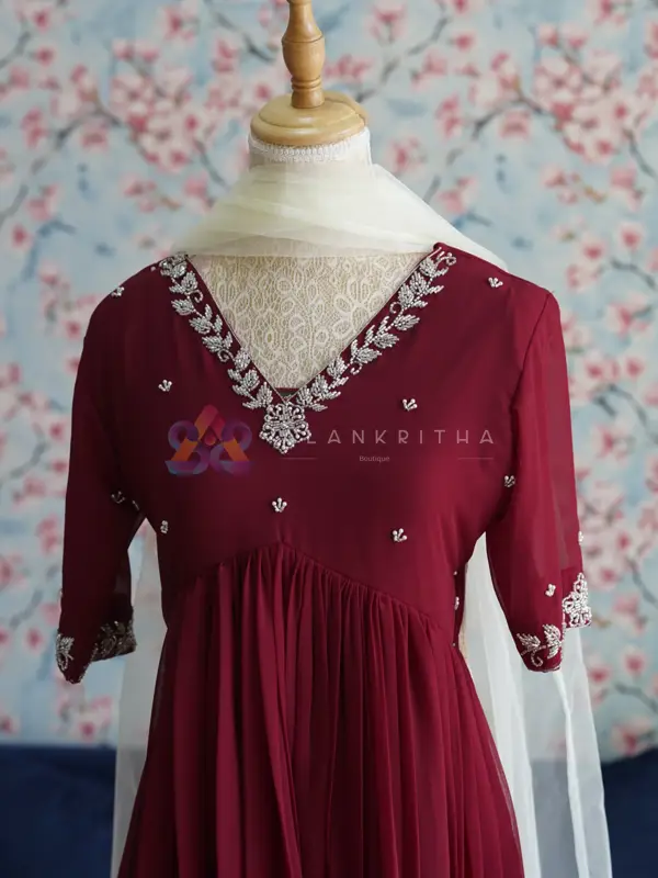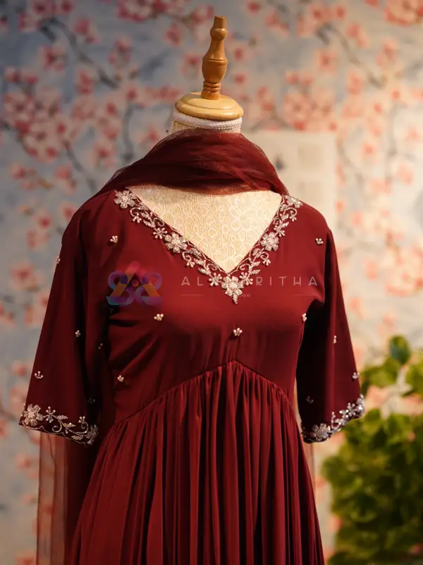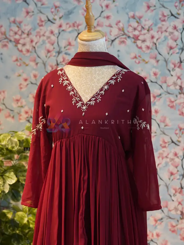 Color: Maroon • Style: Aliacut Top and Dupatta • Neckline: V-neck with intricate hand embroidery • Sleeves: Embroidered sleeve ends • Work: Pure hand embroidery • Fit: Comfortable and flowy silhouette Designed for those who appreciate minimal elegance, this ensemble beautifully blends simplicity with handcrafted detailing, making it perfect for both everyday wear and special occasions.