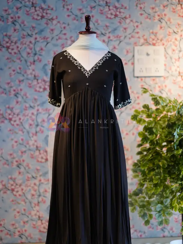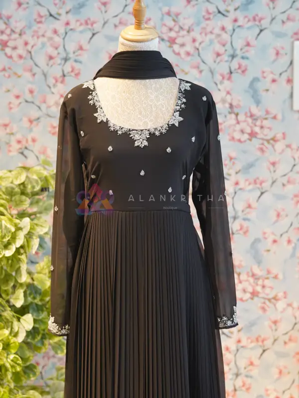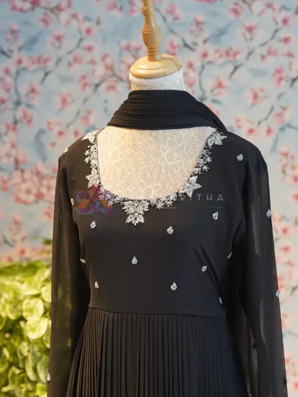 Details: • Color: Black • Style: Pleated Anarkali with dupatta • Neckline: Round-neck with intricate hand embroidery • Sleeves: Embroidered sleeve ends • Work: Pure hand embroidery • Fit: Comfortable and flowy silhouette Designed for those who appreciate minimal elegance, this ensemble beautifully blends simplicity with handcrafted detailing, making it perfect for both everyday wear and special occasions.