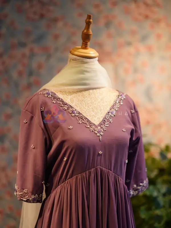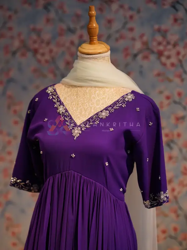 Bring effortless elegance to your festive wardrobe with this stunning plum purple Anarkali, designed with a graceful and flowy silhouette. The rich, regal tone enhances its sophisticated appeal, making it perfect for special occasions. The outfit features a beautifully tailored pleated top with a flattering round neckline adorned with intricate silver embroidery. Delicate embroidered motifs are scattered across the bodice and sleeves, while the sleeve ends are finished with matching embroidery, adding a refined finish.