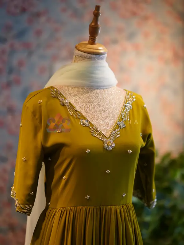 Details: • Color: Olive Green • Style: Aliacut Top with Dupatta • Neckline: V-neck with intricate hand embroidery • Sleeves: Embroidered sleeve ends • Work: Pure hand embroidery • Fit: Comfortable and flowy silhouette Designed for those who appreciate minimal elegance, this ensemble beautifully blends simplicity with handcrafted detailing, making it perfect for both everyday wear and special occasions.