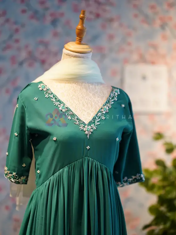 Color: Pastel Green • Style: Aliacut Top with Dupatta • Neckline: V-neck with hand embroidery • Sleeves: Embroidered sleeve ends • Work: Pure hand embroidery • Fit: Comfortable and flowy silhouette Perfect for those who love minimal elegance with handcrafted detailing.