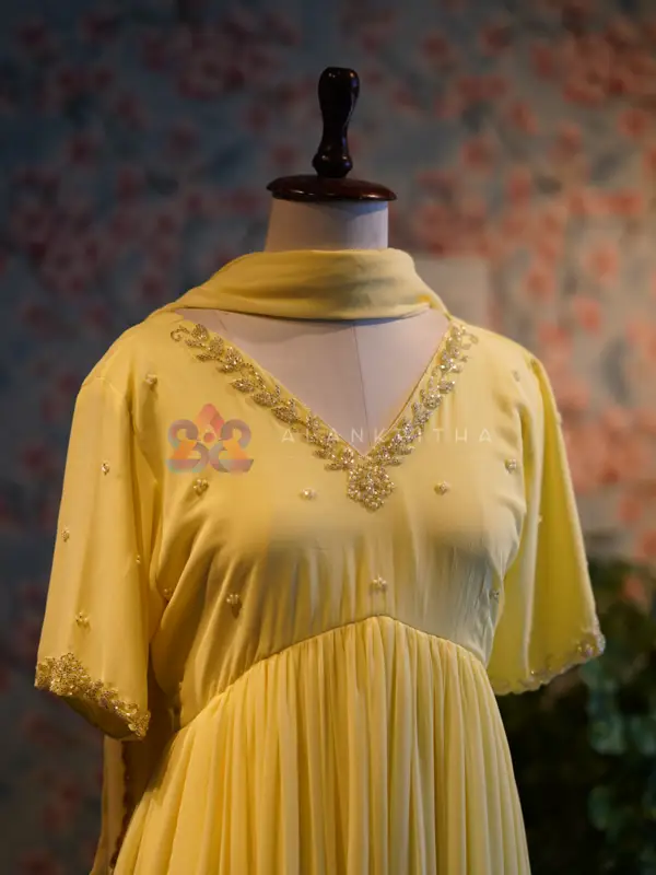 Details: • Color: Yellow • Style: Aliacut Top with Dupatta • Neckline: V-neck with intricate hand embroidery • Sleeves: Embroidered sleeve ends • Work: Pure hand embroidery • Fit: Comfortable and flowy silhouette Designed for those who appreciate minimal elegance, this ensemble beautifully blends simplicity with handcrafted detailing, making it perfect for both everyday wear and special occasions.