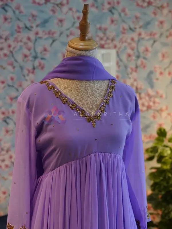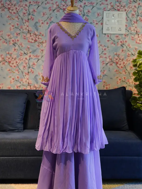 Details: • Color: Lavender • Style: Aliacut Top with Dupatta • Neckline: V-neck with intricate hand embroidery • Sleeves: Embroidered sleeve ends • Work: Pure hand embroidery • Fit: Comfortable and flowy silhouette Designed for those who appreciate minimal elegance, this ensemble beautifully blends simplicity with handcrafted detailing, making it perfect for both everyday wear and special occasions.