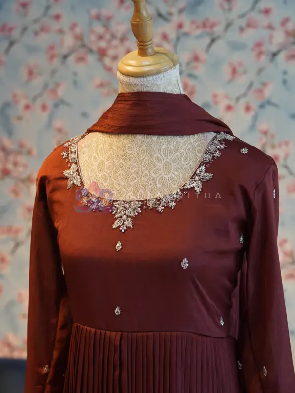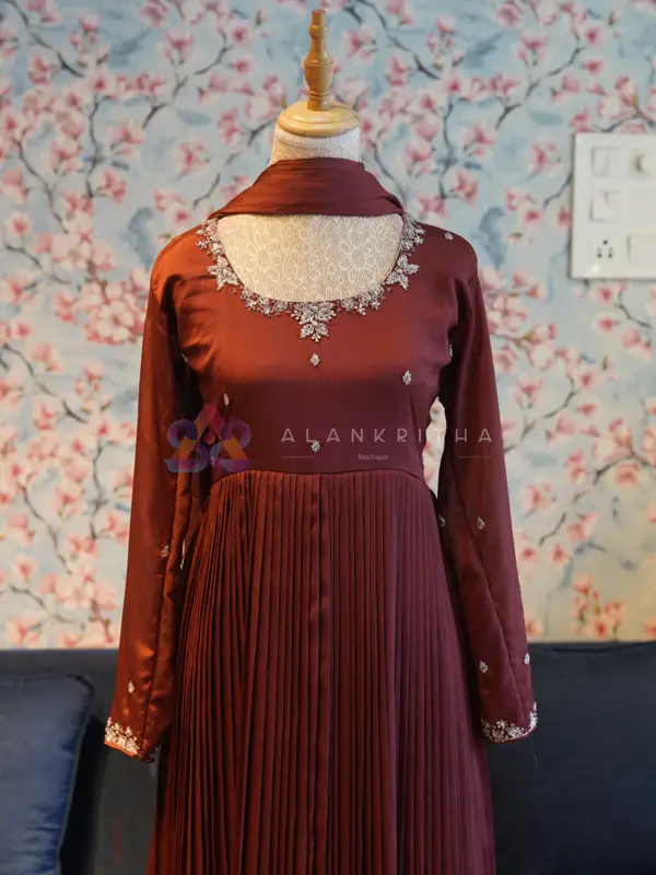 Details: • Color: Copper Brown • Style: Pleated Anarkali with Dupatta • Neckline: Round-neck with intricate hand embroidery • Sleeves: Embroidered sleeve ends • Work: Pure hand embroidery • Fit: Comfortable and flowy silhouette Designed for those who appreciate minimal elegance, this ensemble beautifully blends simplicity with handcrafted detailing, making it perfect for both everyday wear and special occasions.
