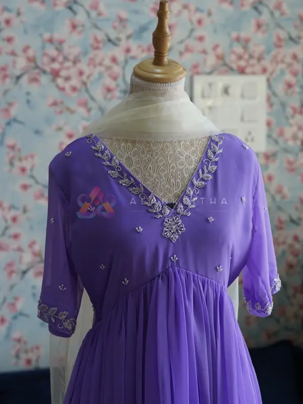Details: • Color: Violet • Style: Aliacut Top with Dupatta • Neckline: V-neck with intricate hand embroidery • Sleeves: Embroidered sleeve ends • Work: Pure hand embroidery • Fit: Comfortable and flowy silhouette Designed for those who appreciate minimal elegance, this ensemble beautifully blends simplicity with handcrafted detailing, making it perfect for both everyday wear and special occasions.