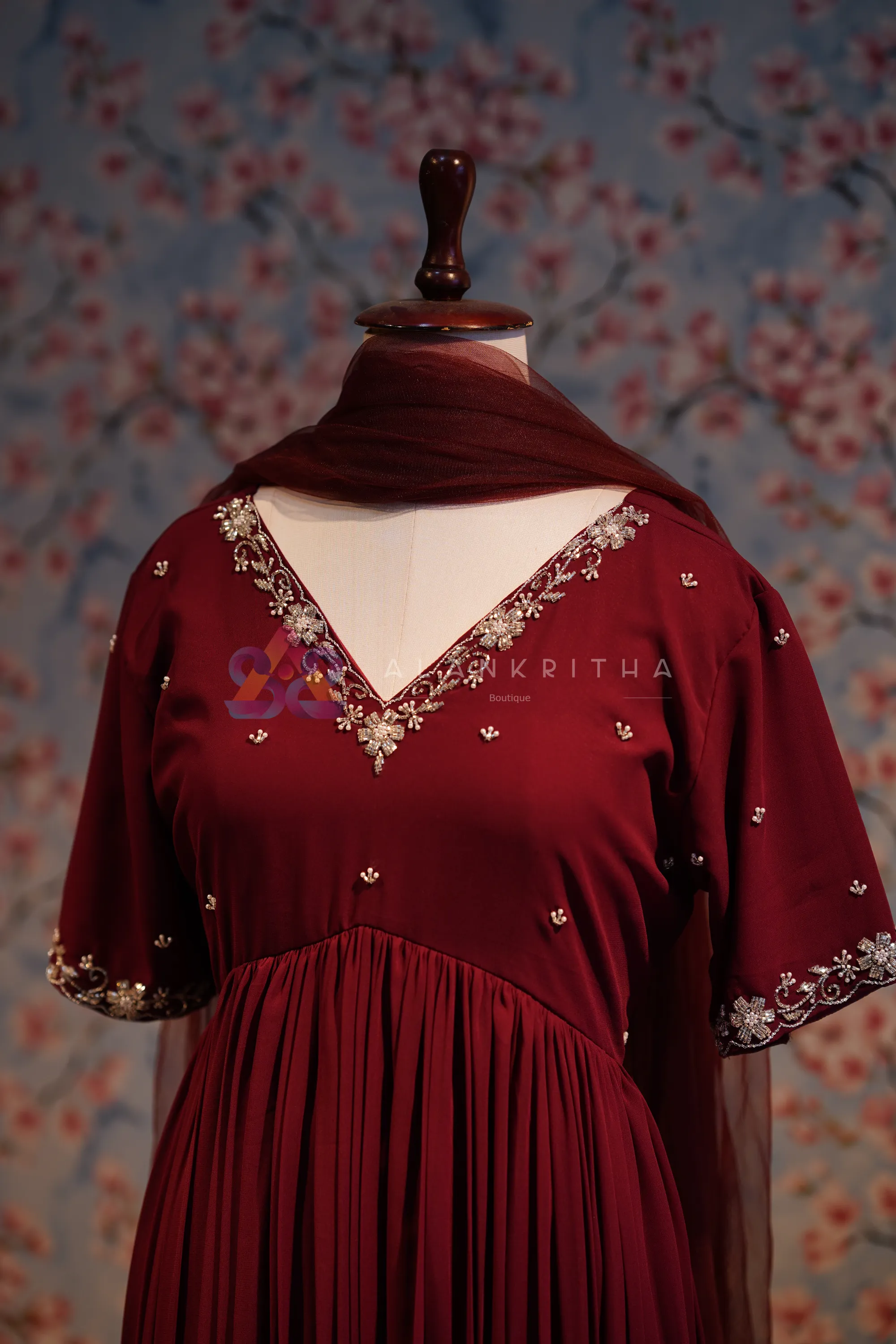 Step into timeless elegance with our Georgette Alia-Cut Anarkali, designed to flatter with its flowing silhouette and rich craftsmanship.
