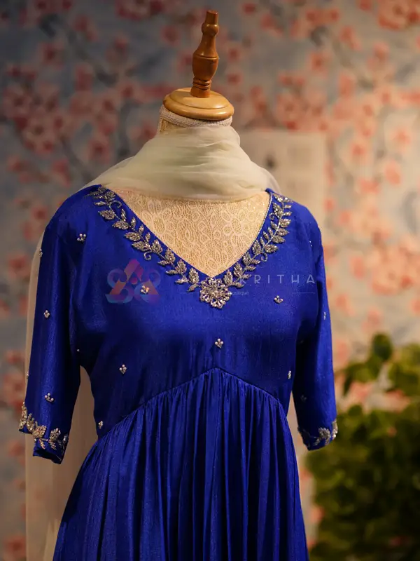 Command attention with our exquisite Alia-Cut Anarkali, fashioned from luxurious Vichitra Silk in a deep, captivating Royal Blue. This outfit combines a modern, flattering silhouette with the rich texture and opulent sheen of traditional silk, making it the ultimate choice for grand celebrations.