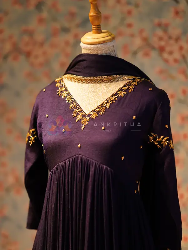 Indulge in the rich texture and deep hues of our stunning Purple Vichitra Silk Alia-Cut Anarkali. This magnificent piece is designed to command attention, blending the opulence of the jewel-toned fabric with a contemporary, flattering silhouette.
