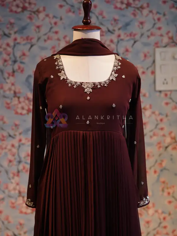 Brown Pleated Anarkali with Hand-Embroidered Sleeves