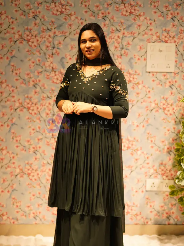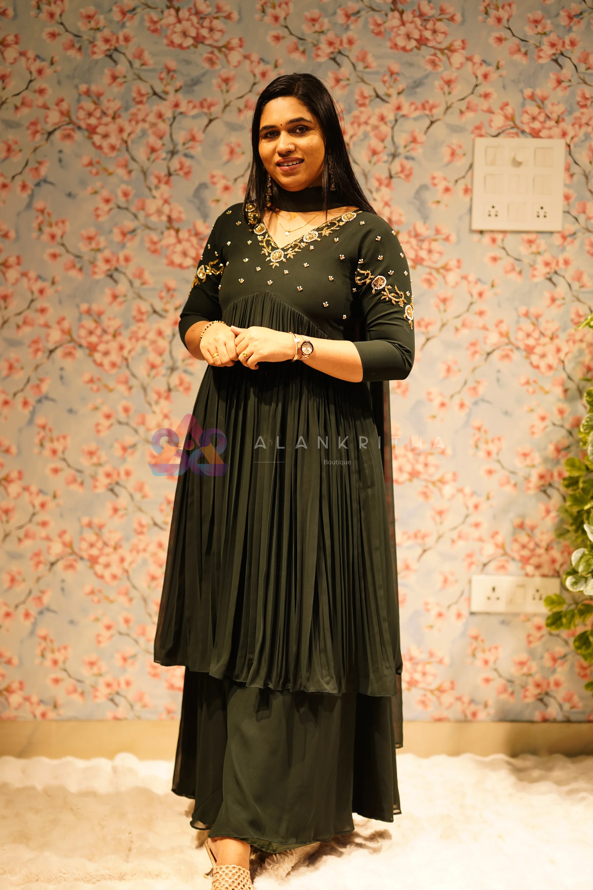 Emerald Depth: Dark Green Pleated Anarkali with Hand-Embroidered Sleeves