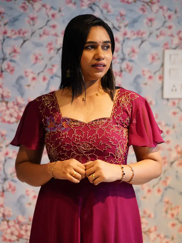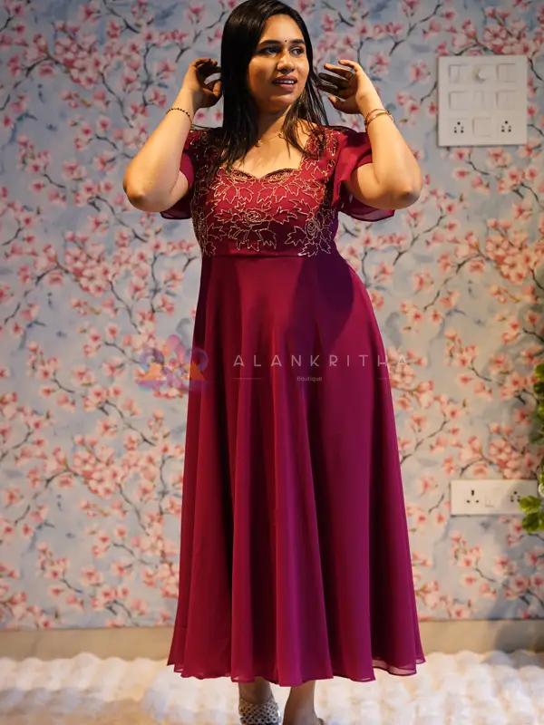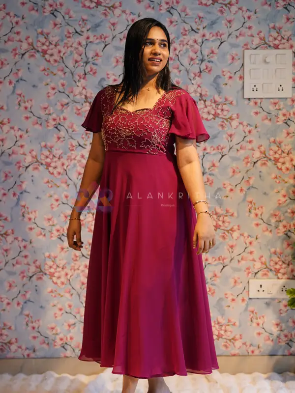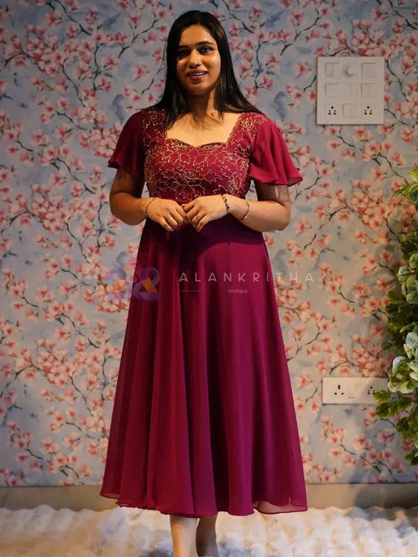 Introducing a blend of playful flair and deep sophistication with our stunning Burgundy Frock. Featuring beautiful Butterfly Sleeves, this piece is designed for elegant movement and is perfect for modern parties, evening dates, and semi-formal events.