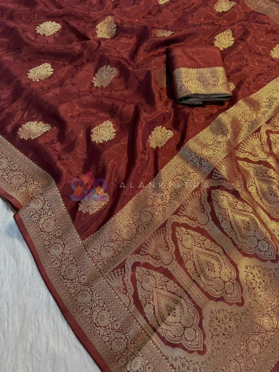 Experience the perfect harmony of traditional weaving and modern luxury with our Brown Viscose Russian Saree. Featuring an intricate self-jacquard pattern and a luminous finish, this saree is designed for the woman who appreciates subtle yet grand sophistication.