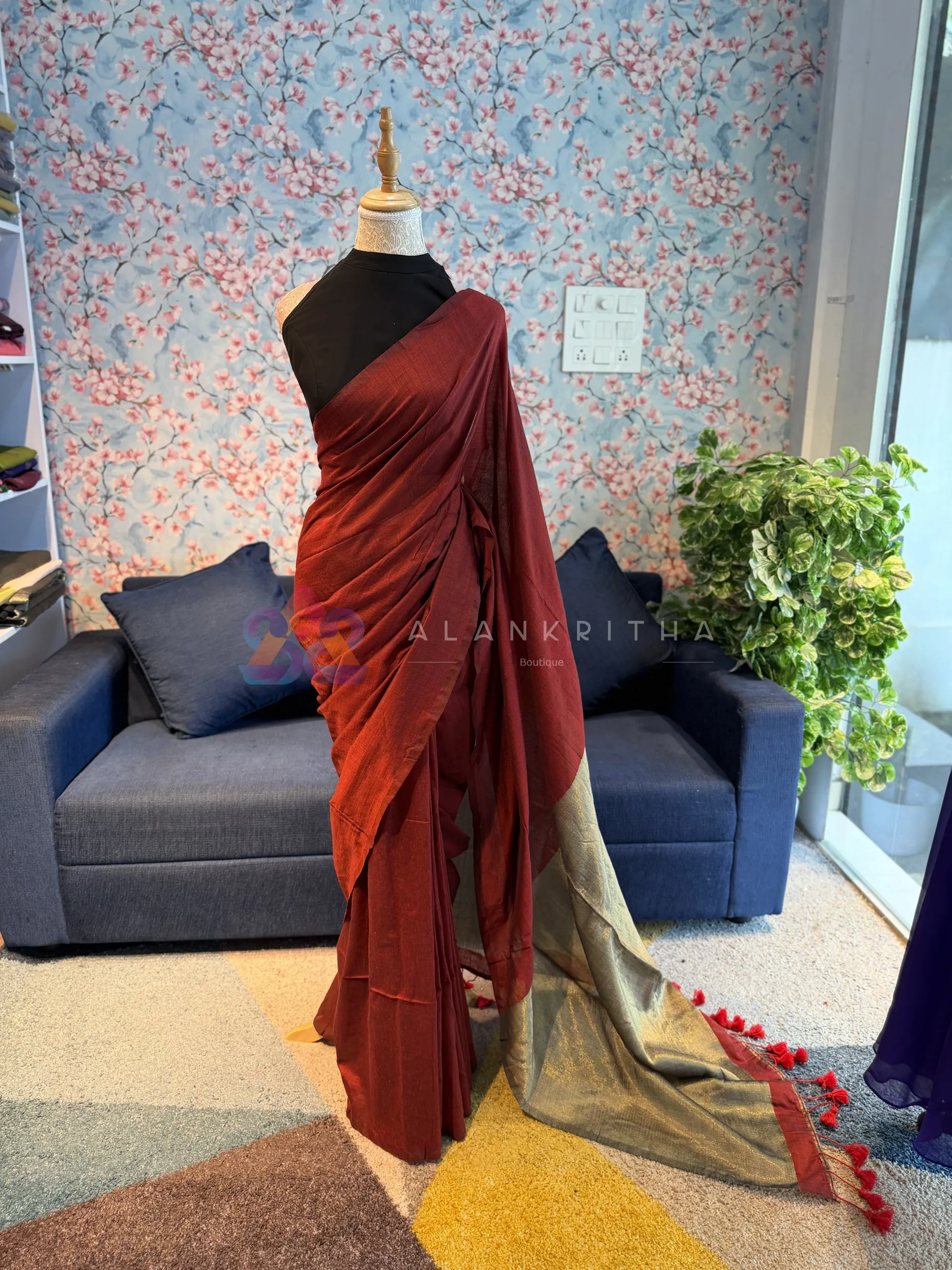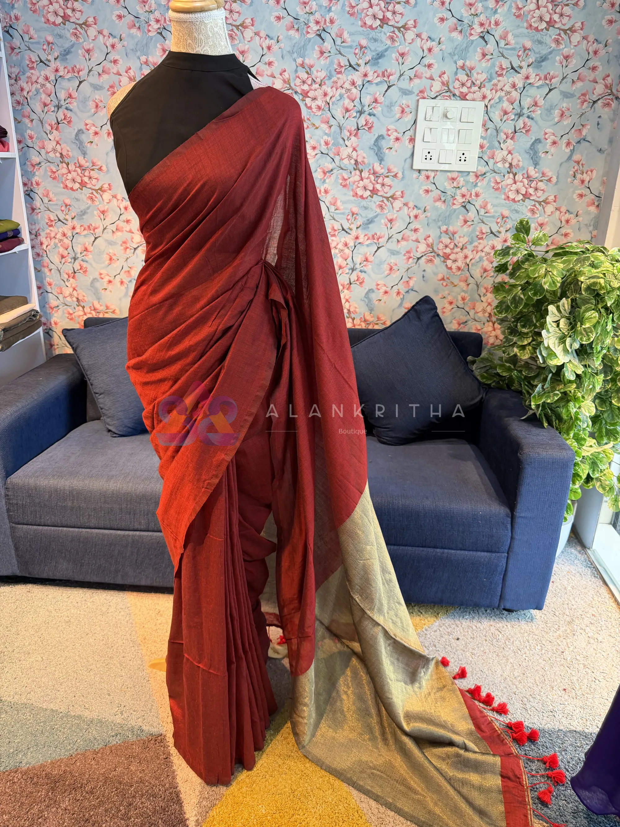 Border & Pallu: Metallic zari finish (gold tone)
