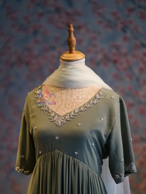 - Exclusive Custom Shade – Pastel Green: This Alia-Cut Suit has been reimagined in a soothing Pastel Green hue, bringing a soft, refreshing charm to the bold elegance of the original red design. The delicate color adds a serene, graceful appeal perfect for daytime festivities. Matching Net Dupatta: Paired with a lightweight net dupatta in the same pastel green tone, beautifully finished with subtle embroidery, lending an airy and ethereal touch to the ensemble. Intricate Hand Embroidery: The hand-embroidered detailing has been delicately adjusted to complement the pastel base, allowing the craftsmanship to shine with understated sophistication. Signature Alia-Cut Silhouette: The classic pleated Alia-cut pattern maintains its flattering structure, offering a blend of modern fit and flowing elegance.
