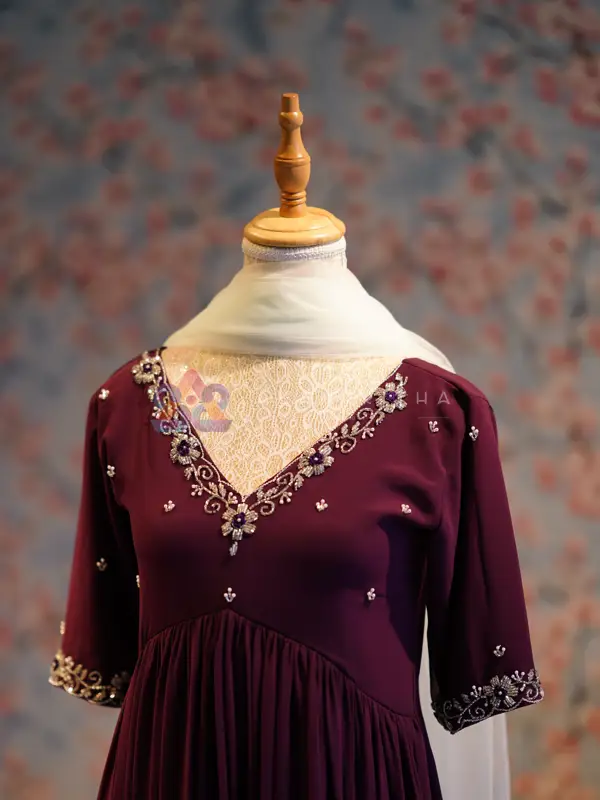- Exclusive Custom Shade – Maroon: This Alia-Cut Suit is re-envisioned in a deep Maroon hue, offering a regal, refined alternative to the original crimson tone. The rich shade enhances the handcrafted embroidery, giving the ensemble a more luxurious and timeless appeal. Contrasting White Net Dupatta: Paired with a soft white net dupatta, creating a stunning visual balance against the maroon base. The dupatta is delicately finished with minimal detailing for a graceful, airy touch. Original Hand Embroidery: The intricate embroidery — featuring fine threadwork, sequins, and zari elements — has been retained exactly as in the original design to preserve its signature craftsmanship. Flattering Alia-Cut Silhouette: The elegant pleated Alia-cut structure ensures a beautifully fitted bodice with flowing volume below, adding movement and grace to every step.