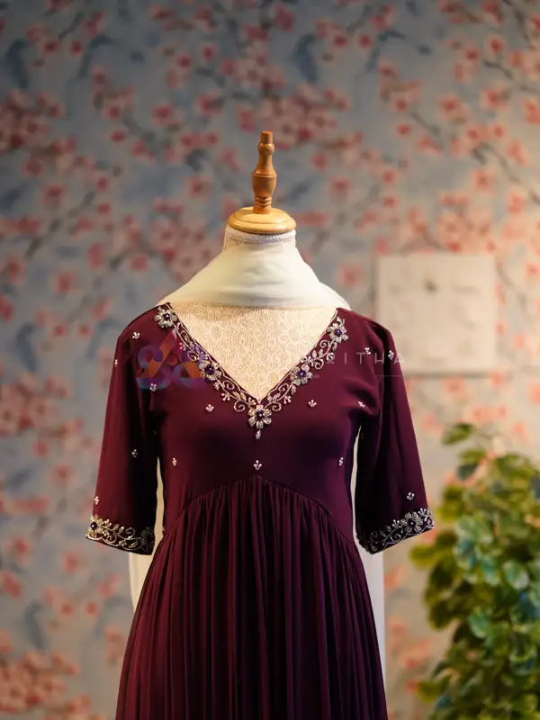 - The transition from crimson to maroon infuses this classic design with quiet grandeur. Paired with a white net dupatta, the look becomes effortlessly refined — bold yet graceful. This customized creation preserves the essence of our original artistry while embracing a timeless, regal mood.