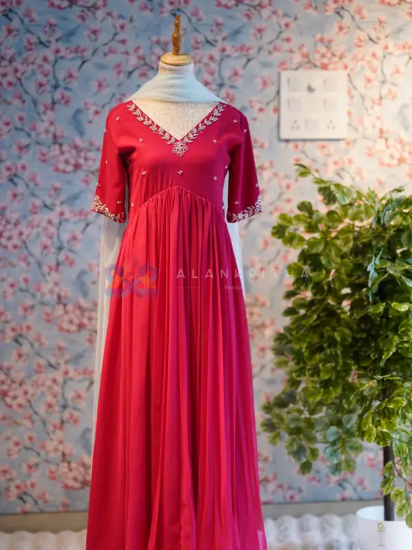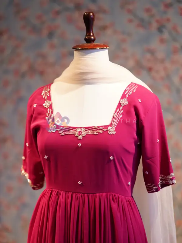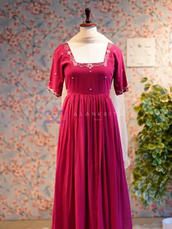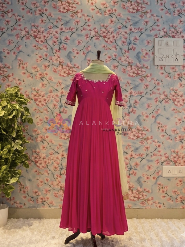 Details: • Color: Rani pink • Style: Pleated Aliacut with Dupatta • Neckline: Square-neck with intricate hand embroidery • Sleeves: Embroidered sleeve ends • Work: Pure hand embroidery • Fit: Comfortable and flowy silhouette Designed for those who appreciate minimal elegance, this ensemble beautifully blends simplicity with handcrafted detailing, making it perfect for both everyday wear and special occasions.