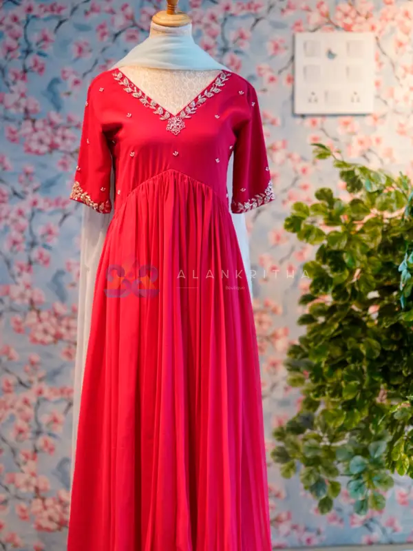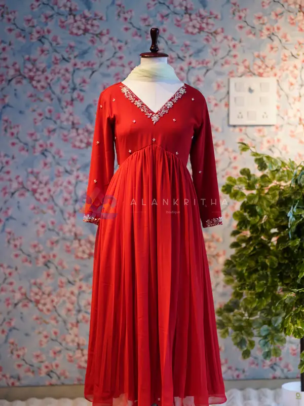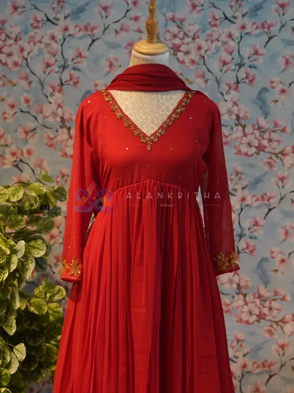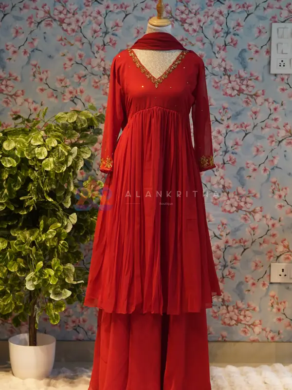 Color: Chilly Red Aliacut • Style: Aliacut Top with Dupatta • Neckline: V-neck with hand embroidery • Sleeves: Embroidered sleeve ends • Work: Pure hand embroidery • Fit: Comfortable and flowy silhouette Perfect for those who love minimal elegance with handcrafted detailing.
