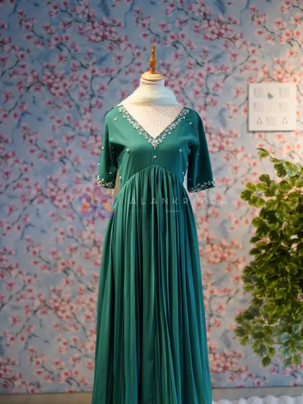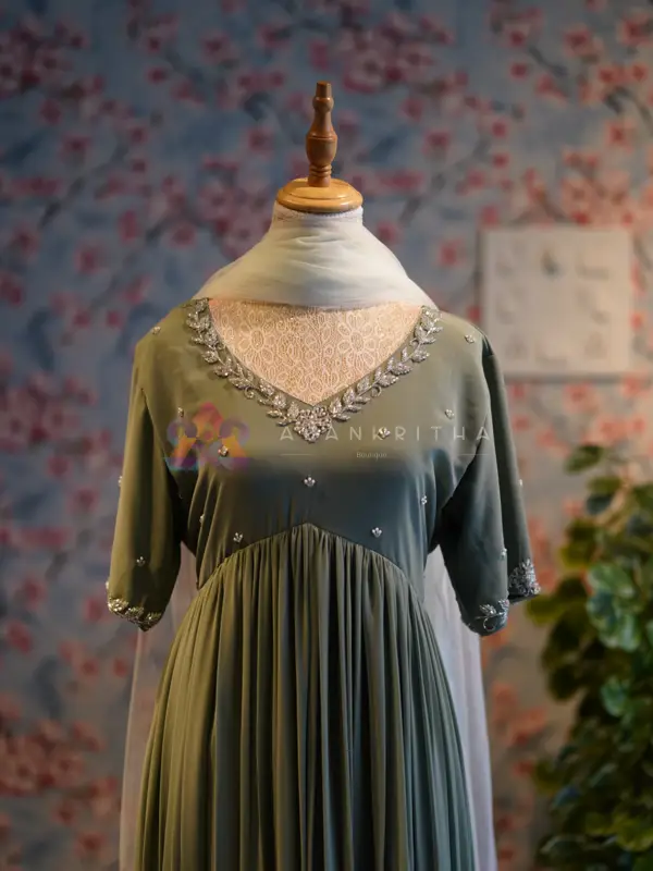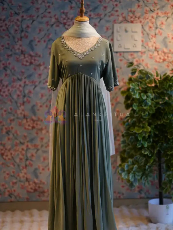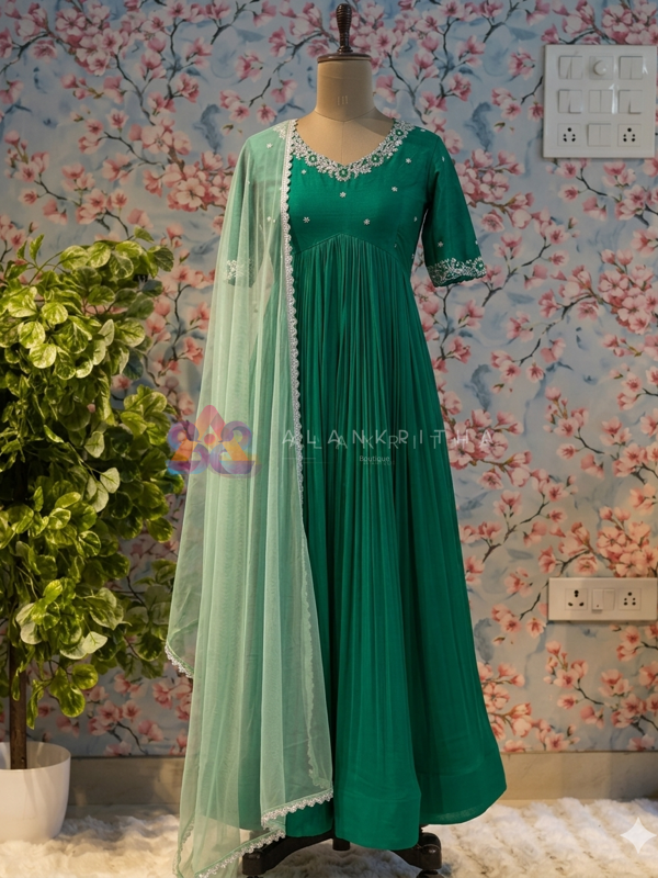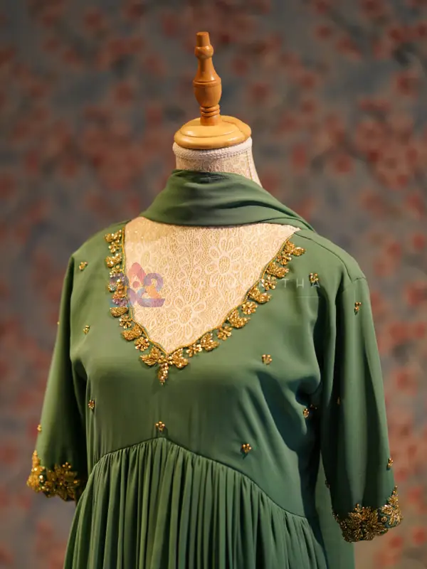 Details: • Color: Green • Style: Pleated Aliacut with Dupatta • Neckline: V-neck with intricate hand embroidery • Sleeves: Embroidered sleeve ends • Work: Pure hand embroidery • Fit: Comfortable and flowy silhouette Designed for those who appreciate minimal elegance, this ensemble beautifully blends simplicity with handcrafted detailing, making it perfect for both everyday wear and special occasions.