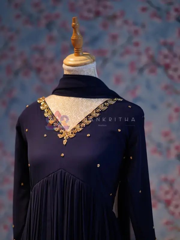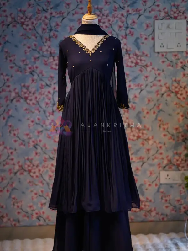 • Color:Navy Blue • Style: Pleated Aliacut with Dupatta • Neckline: V-neck with intricate hand embroidery • Sleeves: Embroidered sleeve ends • Work: Pure hand embroidery • Fit: Comfortable and flowy silhouette Designed for those who appreciate minimal elegance, this ensemble beautifully blends simplicity with handcrafted detailing, making it perfect for both everyday wear and special occasions.