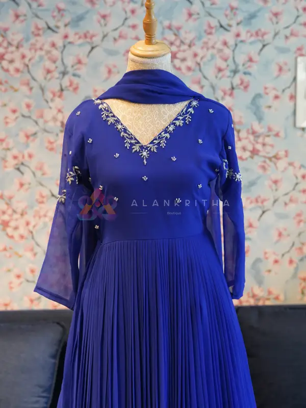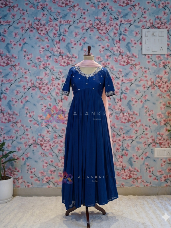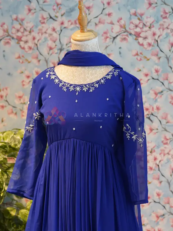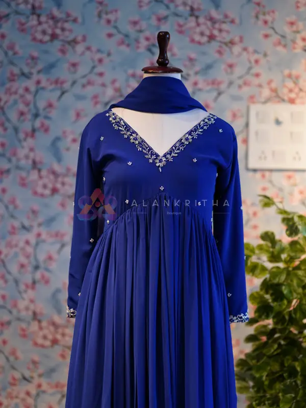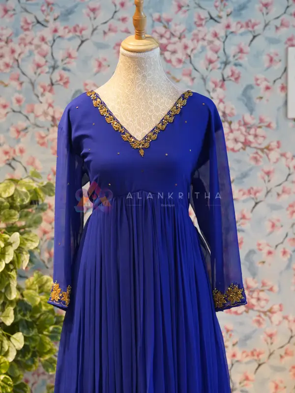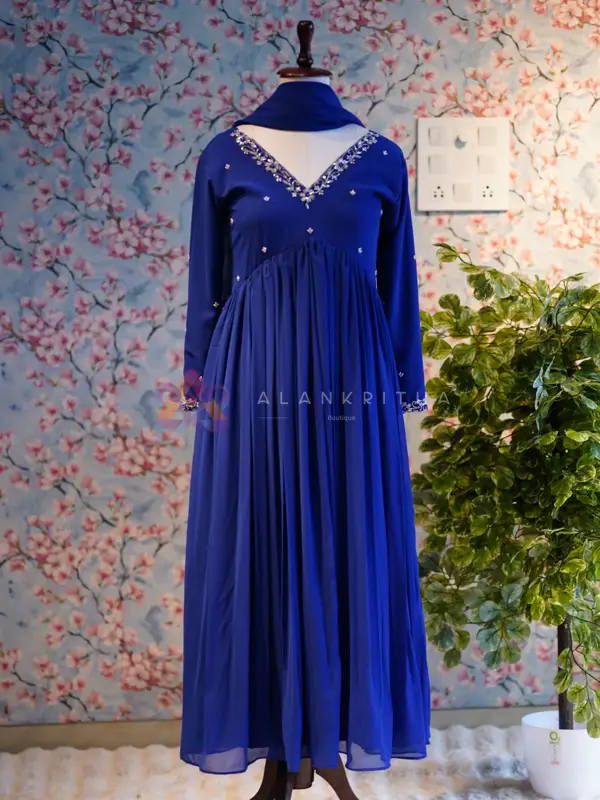 Make a graceful statement with this stunning royal blue aliacut dress, designed with a flowy gathered silhouette that offers both elegance and comfort. The rich hue enhances its premium appeal, making it perfect for festive and evening wear. The dress features a flattering V-neckline highlighted with delicate embroidery, paired with full sleeves finished with matching embroidered detailing at the sleeve ends. The subtle embellishments add a refined touch without overpowering the look.