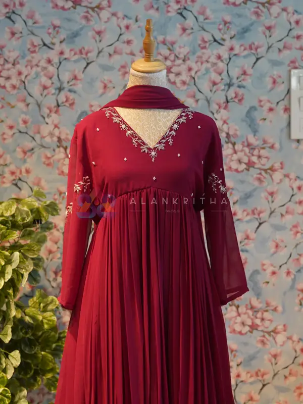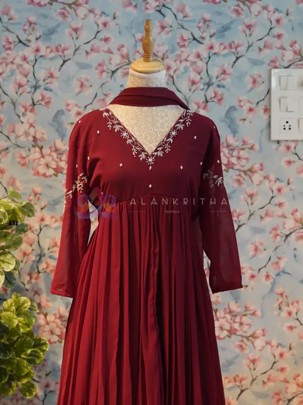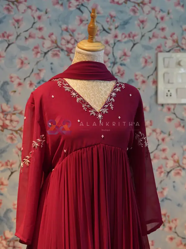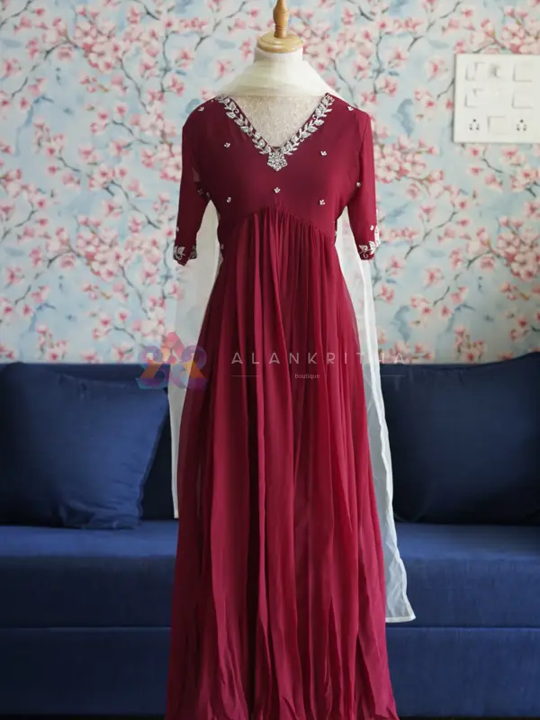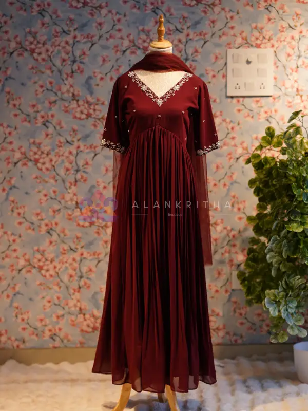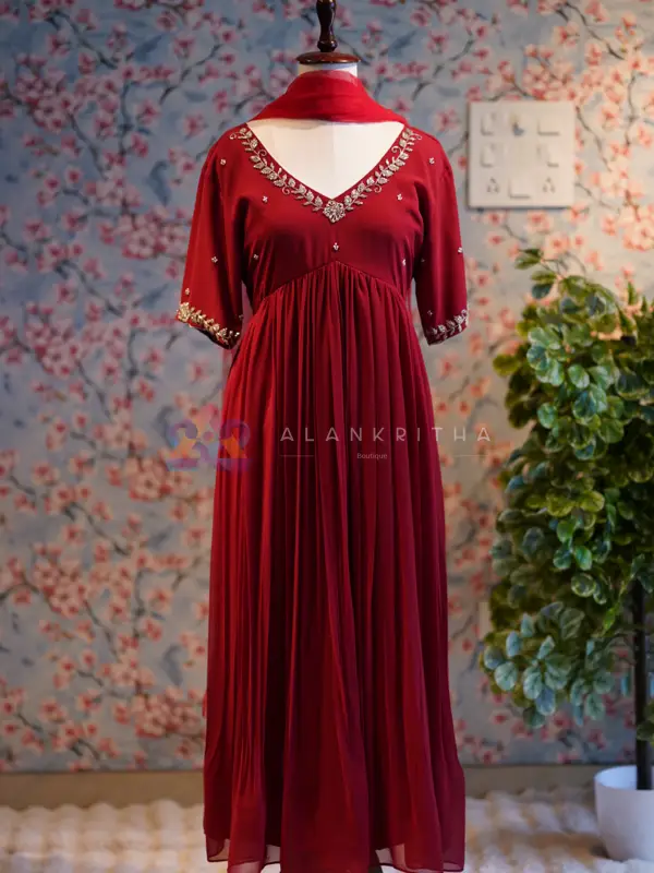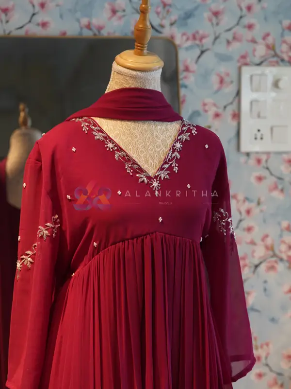 Wine Red Aliacut with Skirt & Dupatta Add a touch of elegance to your wardrobe with this stunning wine red aliacut set, designed to offer a perfect blend of grace and comfort. The rich, deep tone enhances its festive appeal, making it an ideal choice for special occasions and celebrations. The outfit features a beautifully gathered A-line (aliacut) top with a flattering V-neckline adorned with delicate embroidery. Subtle embroidered motifs are placed across the bodice and sleeves, while the sleeve ends are finished with matching embroidery, adding a refined touch. Paired with a coordinated skirt and dupatta, this set creates a complete and effortlessly elegant look.
