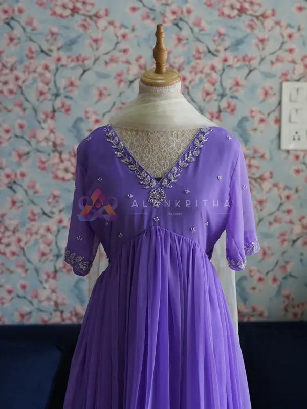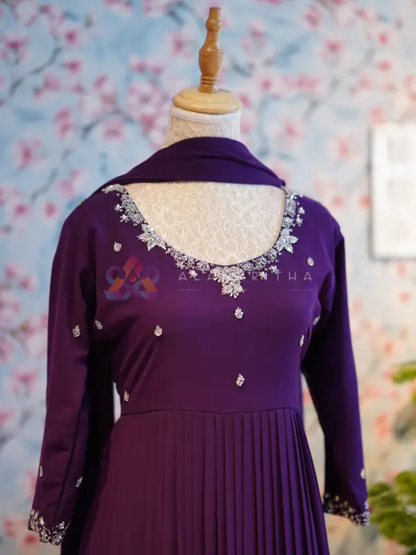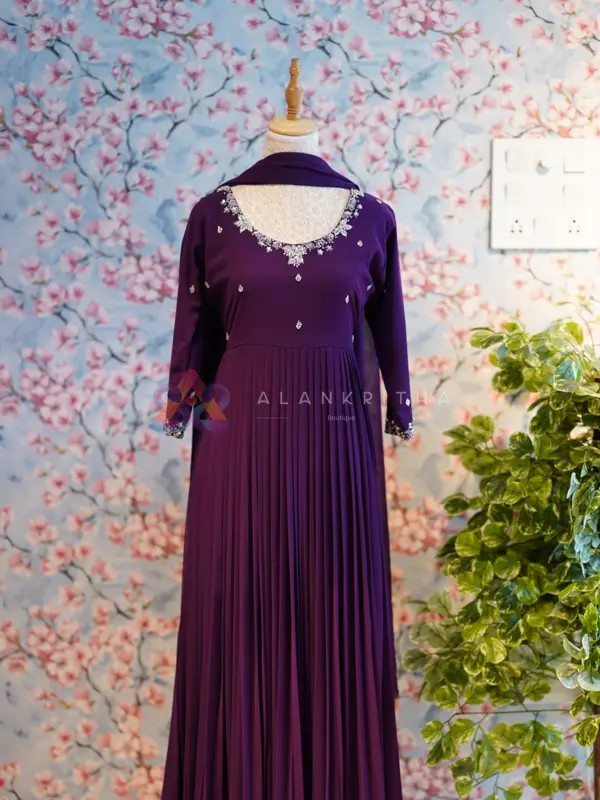 Bring effortless elegance to your festive wardrobe with this stunning plum purple Anarkali, designed with a graceful and flowy silhouette. The rich, regal tone enhances its sophisticated appeal, making it perfect for special occasions. The outfit features a beautifully tailored pleated top with a flattering round neckline adorned with intricate silver embroidery. Delicate embroidered motifs are scattered across the bodice and sleeves, while the sleeve ends are finished with matching embroidery, adding a refined finish.