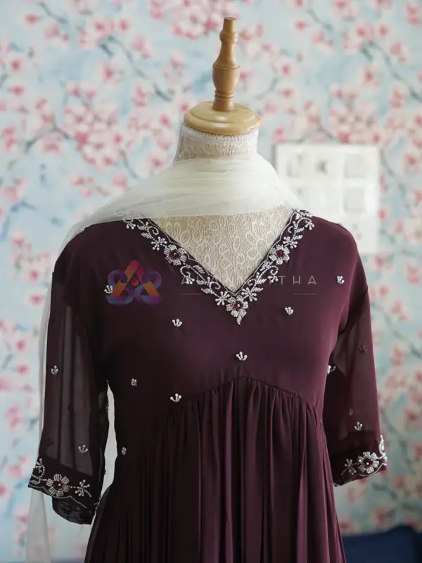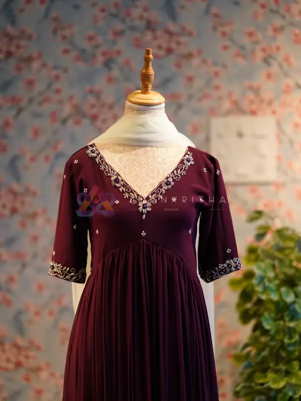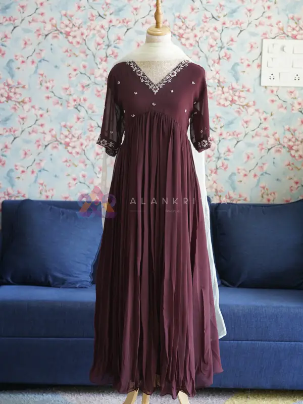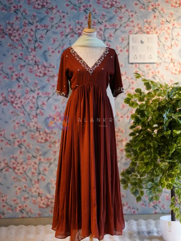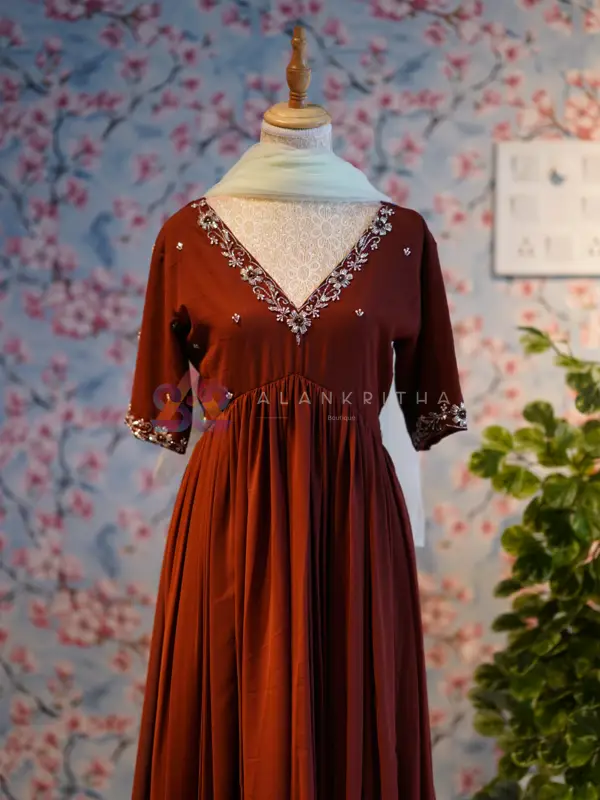 Details: • Color: Brownish Maroon • Style: Aliacut Top with Skirt and Dupatta • Neckline: V-neck with intricate hand embroidery • Sleeves: Embroidered sleeve ends • Work: Pure hand embroidery • Fit: Comfortable and flowy silhouette Perfect for those who love minimal elegance with beautiful handcrafted detailing, making it ideal for both everyday wear and special occasions.